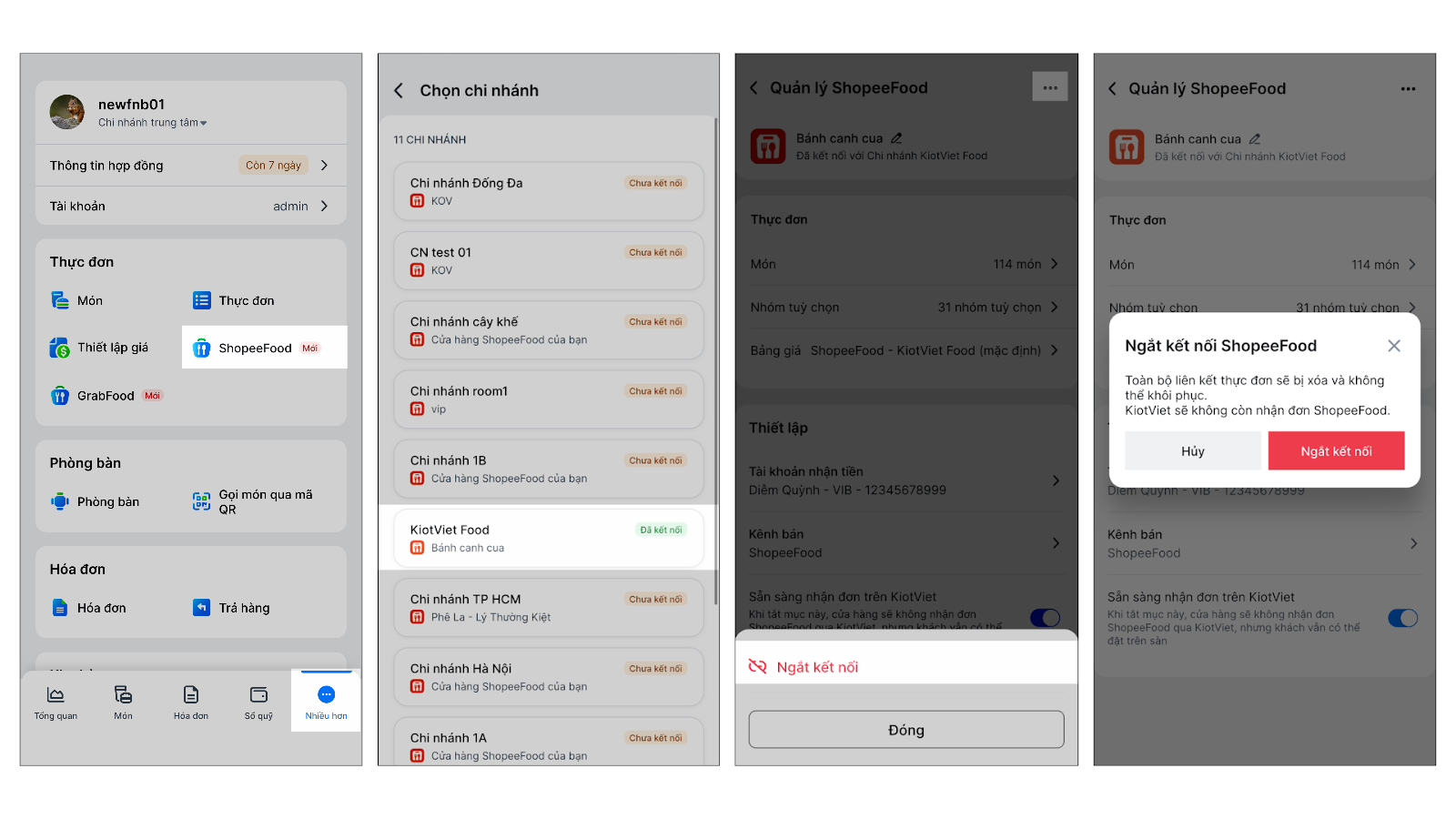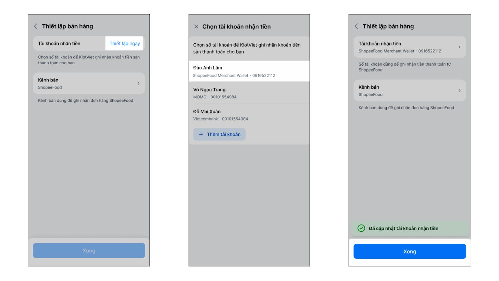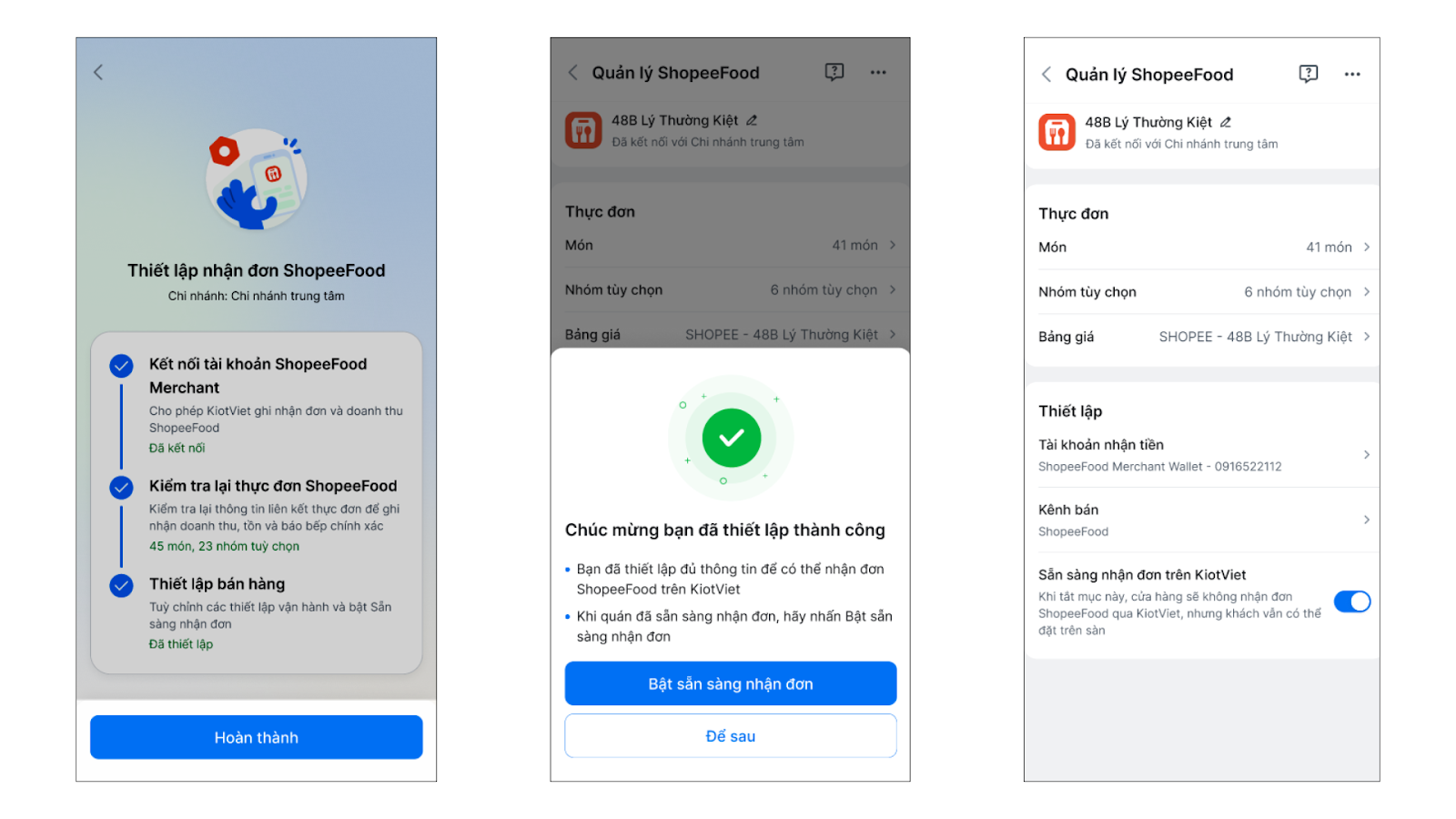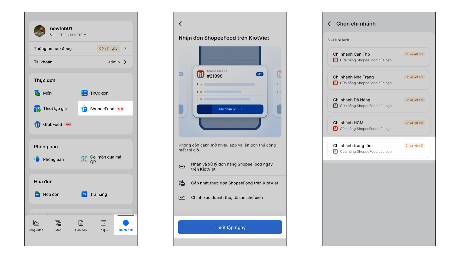 Tình huống: Sau khi hoàn tất liên kết thực đơn, bạn tiến hành thiết lập vận hành để đảm bảo các đơn hàng từ ShopeeFood khi về KiotViet sẽ được ghi nhận đúng kênh bán, tiền thanh toán được ghi nhận vào đúng tài khoản nhận tiền.