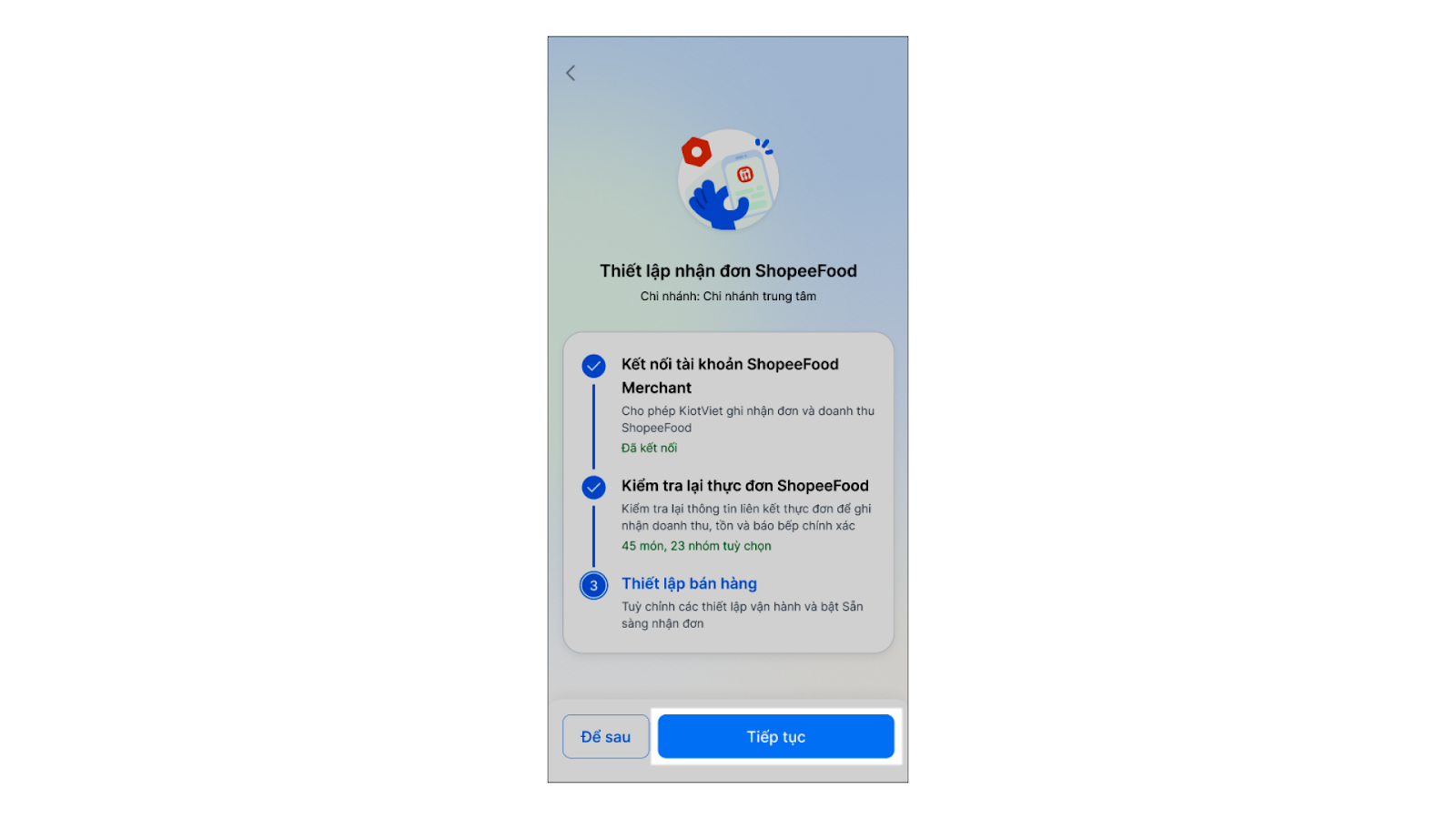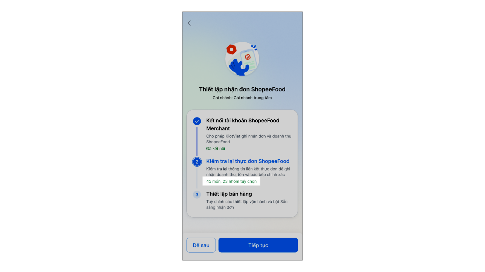 - Bước 1: Sau khi chọn chi nhánh cần kết nối, hệ thống chuyển đến màn hình Thiết lập nhận đơn ShopeeFood, bạn đọc hướng dẫn và nhấn Tiếp tục.