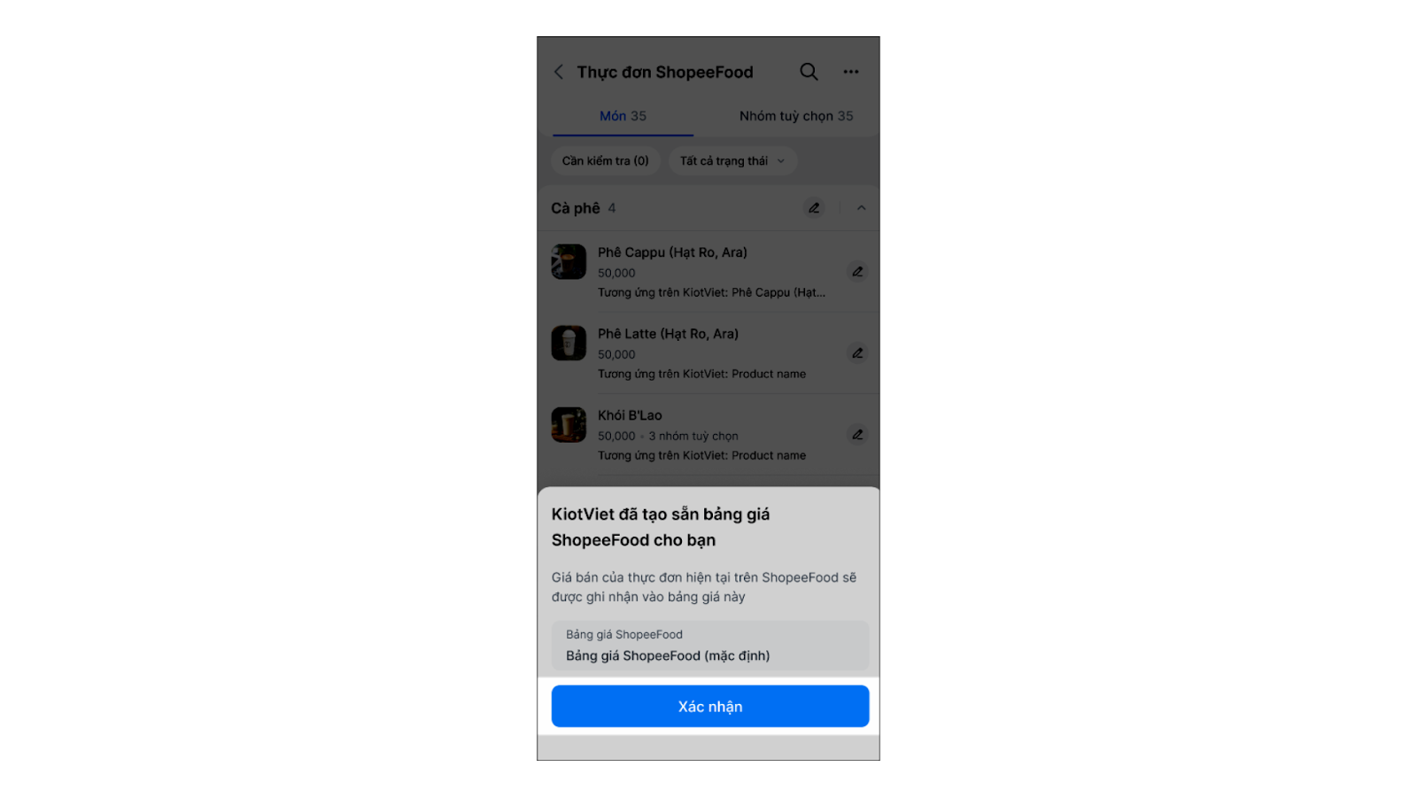 - Bước 2: Hệ thống tự động tạo Bảng giá ShopeeFood để quản lý giá bán của các món trên kênh ShopeeFood. Giá bán của thực đơn hiện tại trên ShopeeFood sẽ được ghi nhận vào bảng giá này. Bạn nhấn Xác nhận.