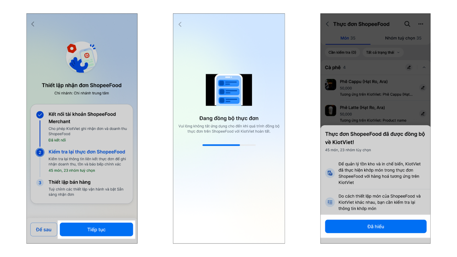 - Bước 1: Tại bước Kiểm tra thực đơn ShopeeFood, bạn nhấn Tiếp tục → hệ thống tự động thực hiện khớp món trong thực đơn ShopeeFood với hàng hóa tương ứng trên KiotViet dựa trên mức độ tương đồng của tên món từ 80%. Sau khi quá trình đồng bộ kết thúc, bạn nhấn Đã hiểu.