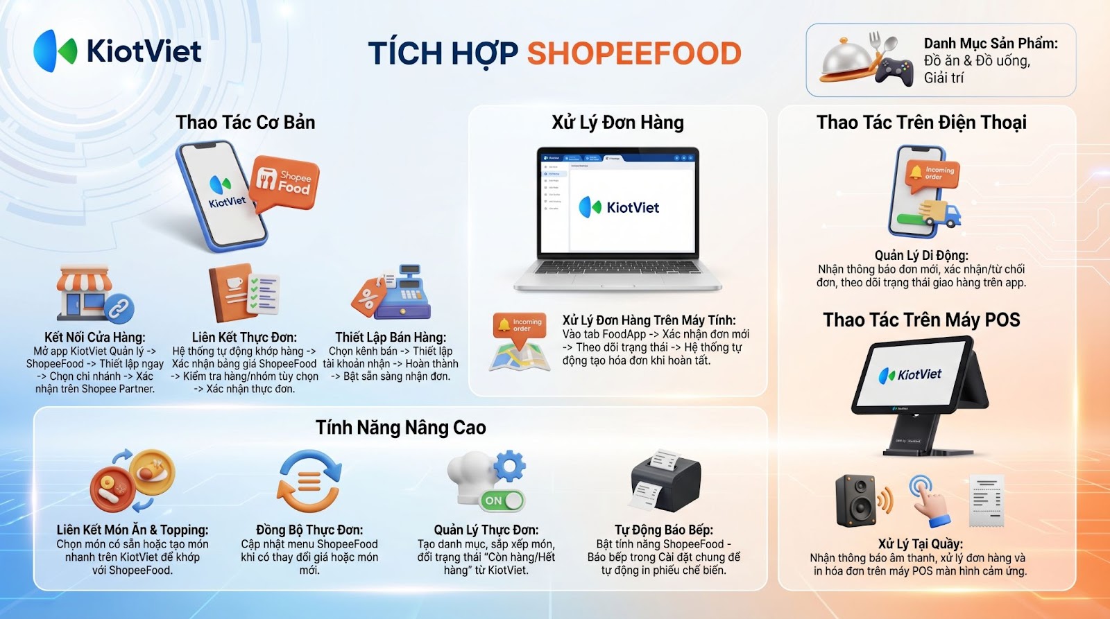 Nhằm hỗ trợ nhà hàng, quán ăn quản lý tập trung hoạt động kinh doanh trên ShopeeFood một cách đơn giản và hiệu quả, KiotViet cung cấp tính năng Tích hợp ShopeeFood, cho phép chủ cửa hàng chủ động thực hiện kết nối chỉ với 3 bước: Kết nối tài khoản Shopee Partner → Liên kết thực đơn → Thiết lập bán hàng. Sau khi hoàn tất, hệ thống tự động nhận đơn, đồng bộ thực đơn và ghi nhận doanh thu từ sàn về KiotViet mà không cần thao tác thủ công.