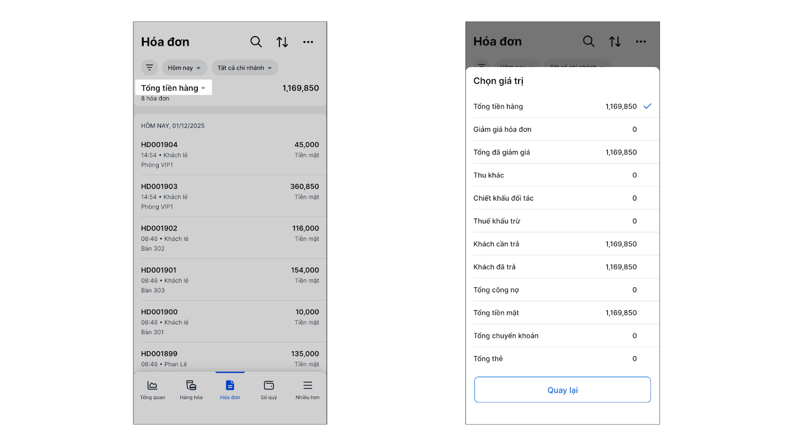 - Lịch sử trả hàng: Hiển thị nếu khách có trả lại hàng (món ăn, đồ uống) từ hóa đơn này.