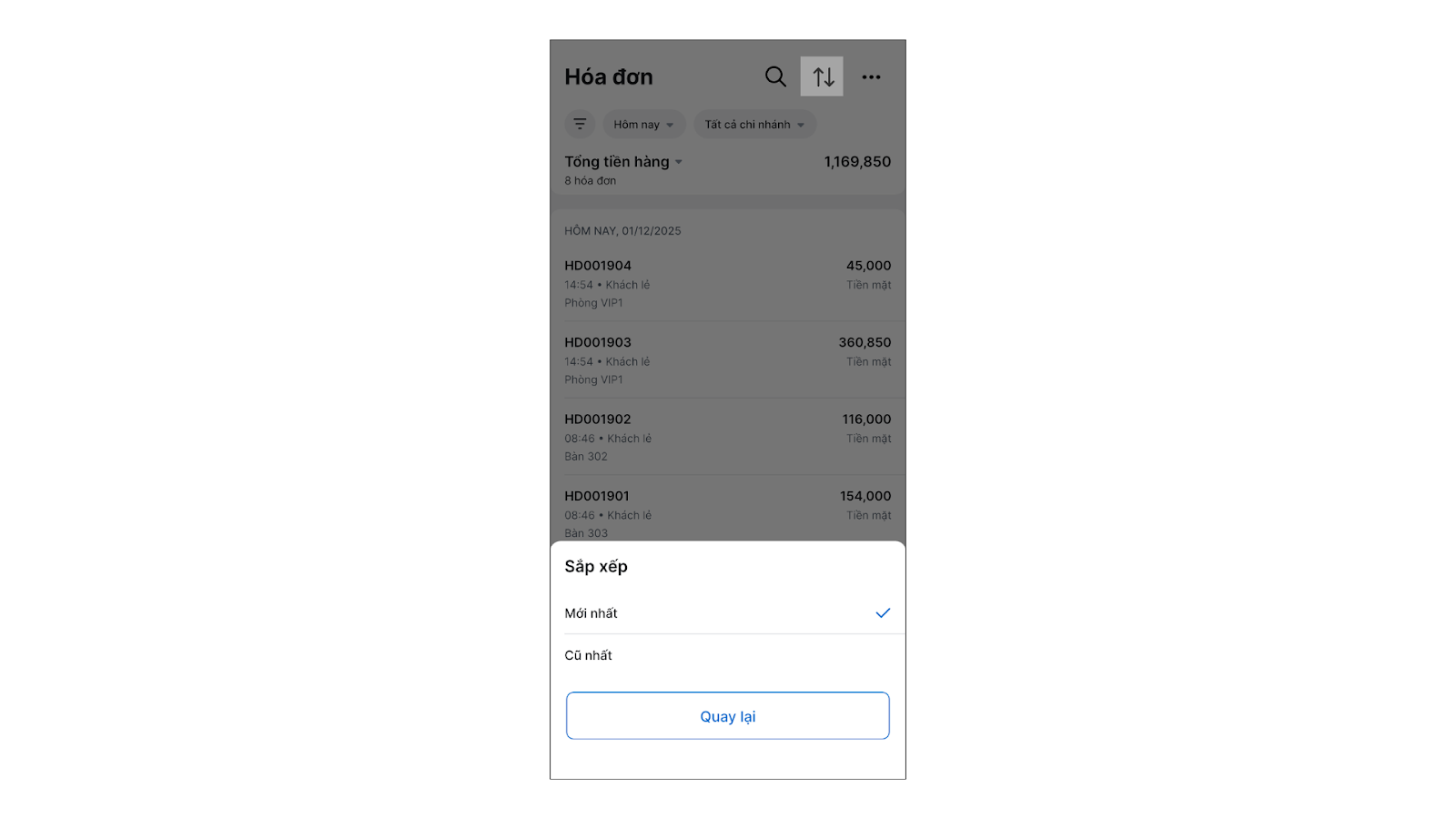 - Bạn cũng có thể sắp xếp danh sách bằng cách nhấn vào tiêu đề các cột (Mã hóa đơn, Thời gian, Khách hàng…).