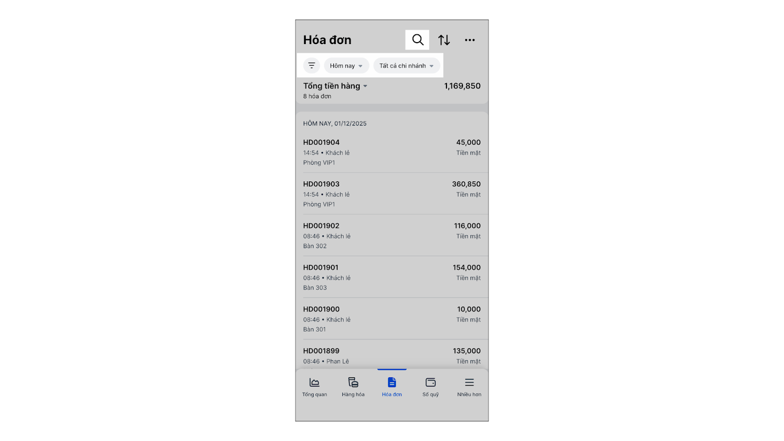 - Tình huống: Bạn muốn tìm lại tất cả các hóa đơn của một khách hàng cụ thể hoặc các hóa đơn thanh toán bằng “Thẻ” trong tháng này.