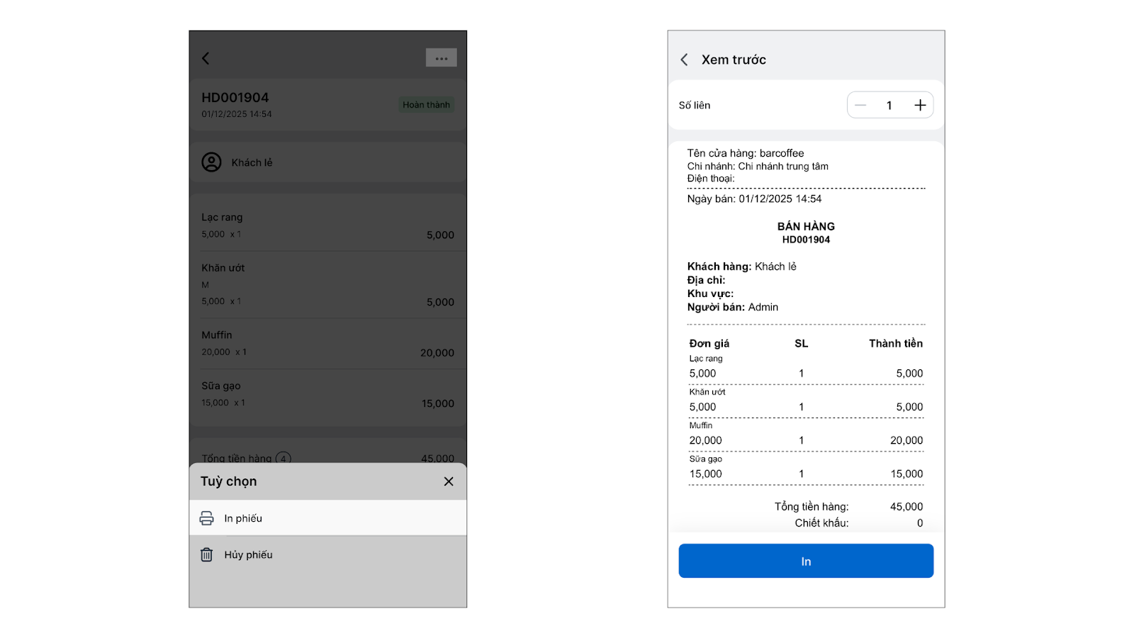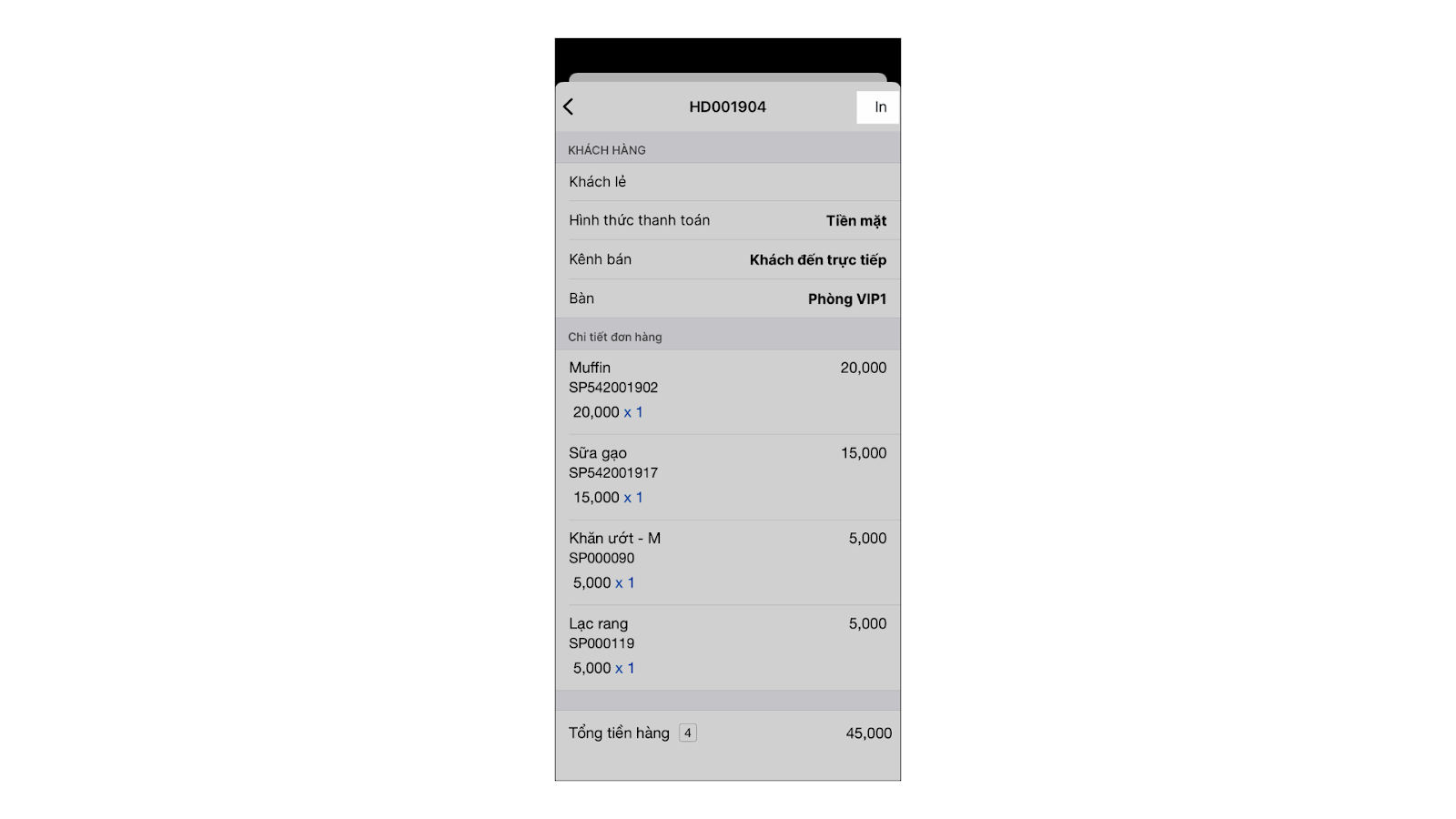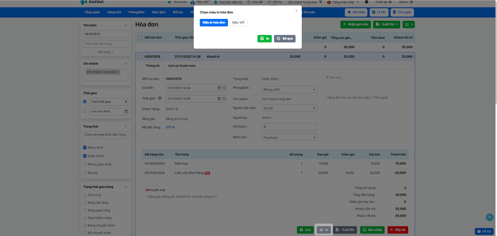 - In hóa đơn: Mở một hóa đơn cụ thể và nhấn In.