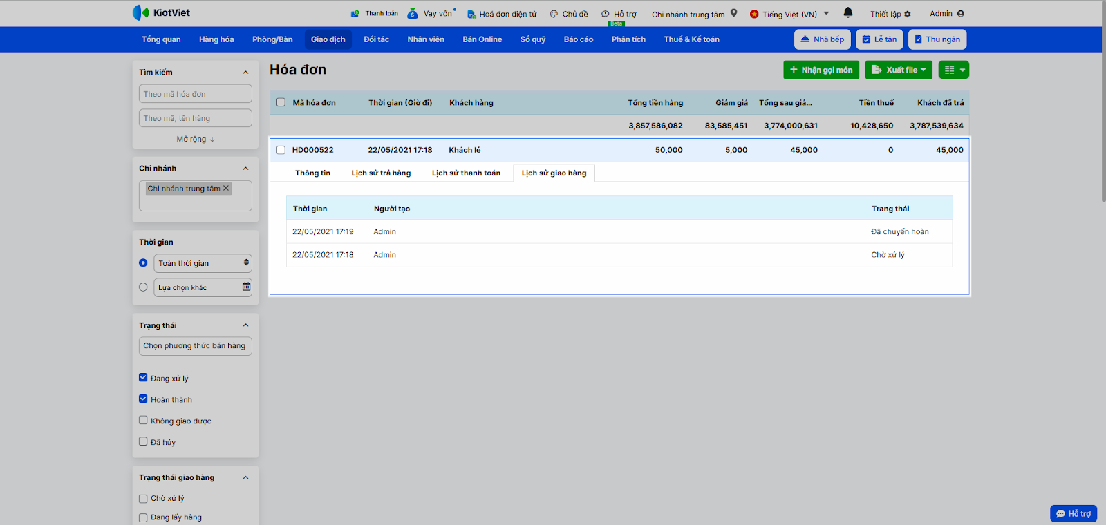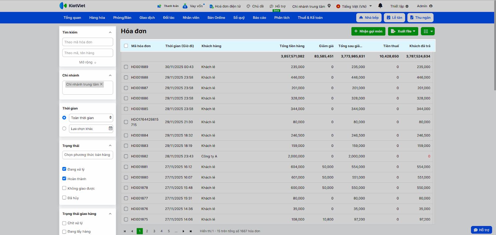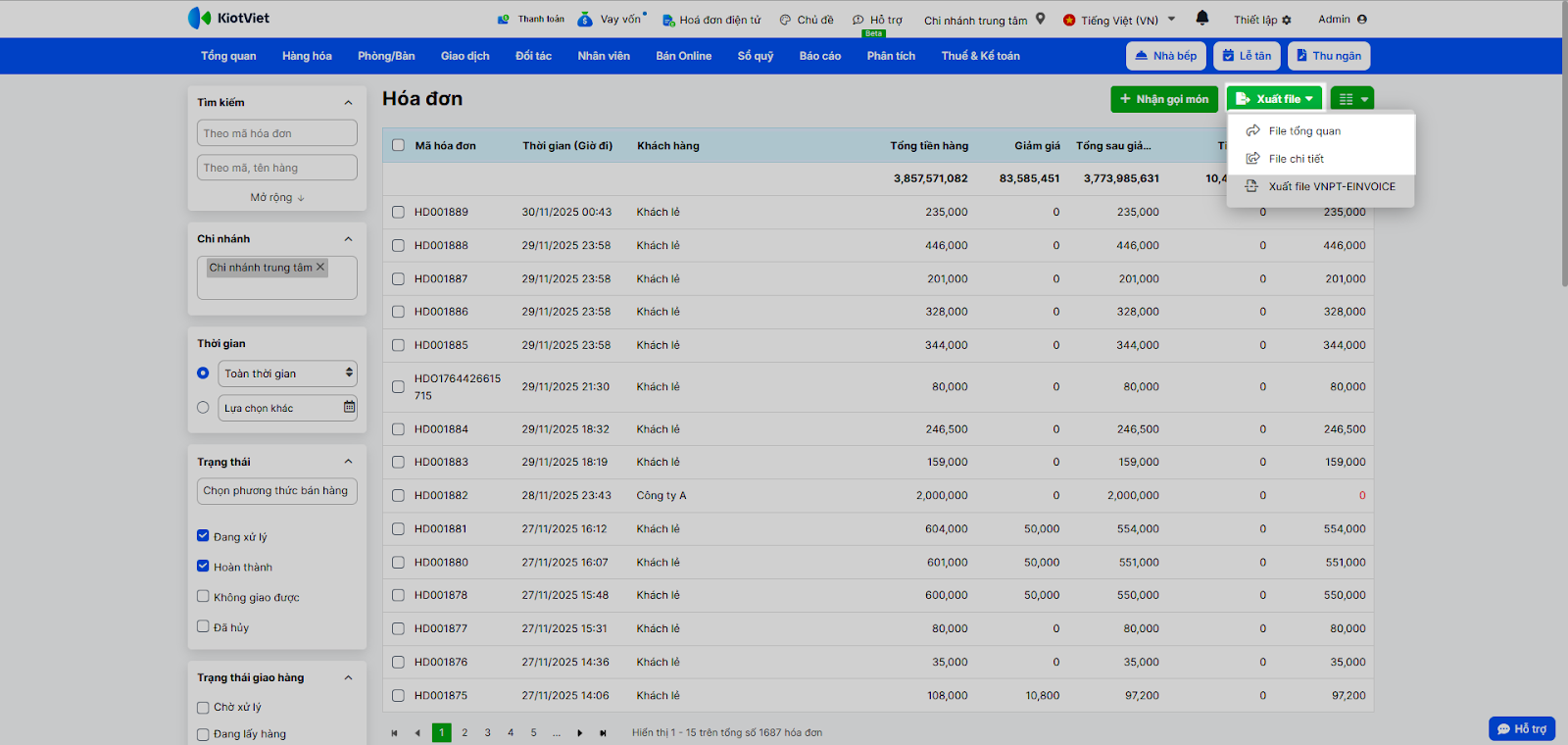 - Thao tác thực hiện như sau: Sử dụng các bộ lọc có sẵn để lọc theo: Thời gian, Chi nhánh, Trạng thái, hoặc tìm theo Mã hóa đơn, Tên/mã hàng, Thông tin khách hàng...