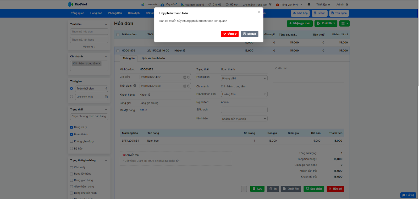 - Nếu hóa đơn đã thanh toán, hệ thống sẽ hỏi “Bạn có muốn hủy những phiếu thanh toán liên quan?”. Bạn nên chọn Đồng ý để hủy cả phiếu thanh toán, đảm bảo dữ liệu tài chính chính xác.