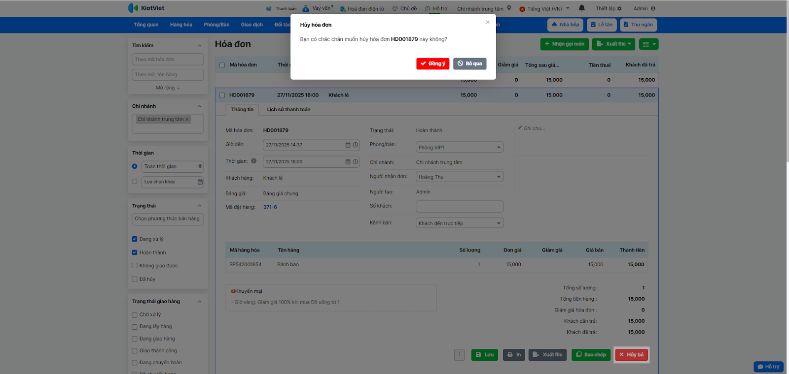 - Tình huống: Nhân viên thu ngân tạo nhầm một hóa đơn (ví dụ: thừa món, sai bàn) và đã lỡ thanh toán. Bạn cần hủy hóa đơn này để điều chỉnh lại doanh thu và hoàn lại tồn kho.