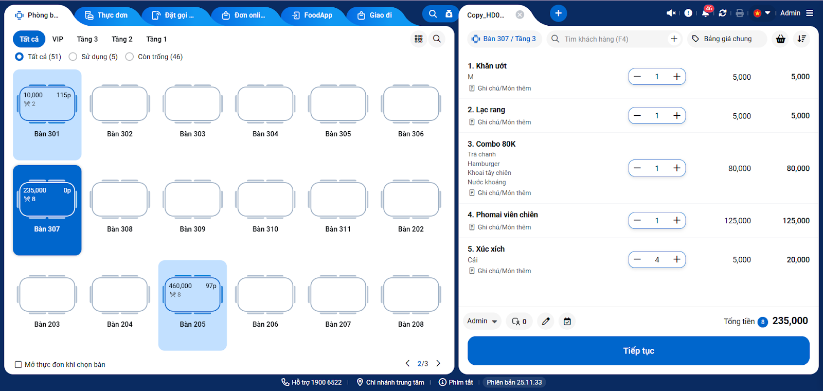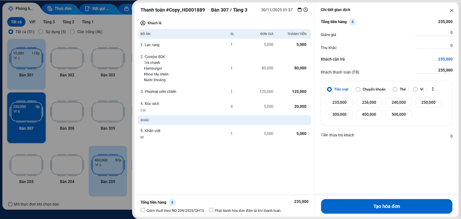- Hệ thống sẽ chuyển sang màn hình Thu ngân với một hóa đơn mới, chứa đầy đủ các món ăn của hóa đơn cũ.
