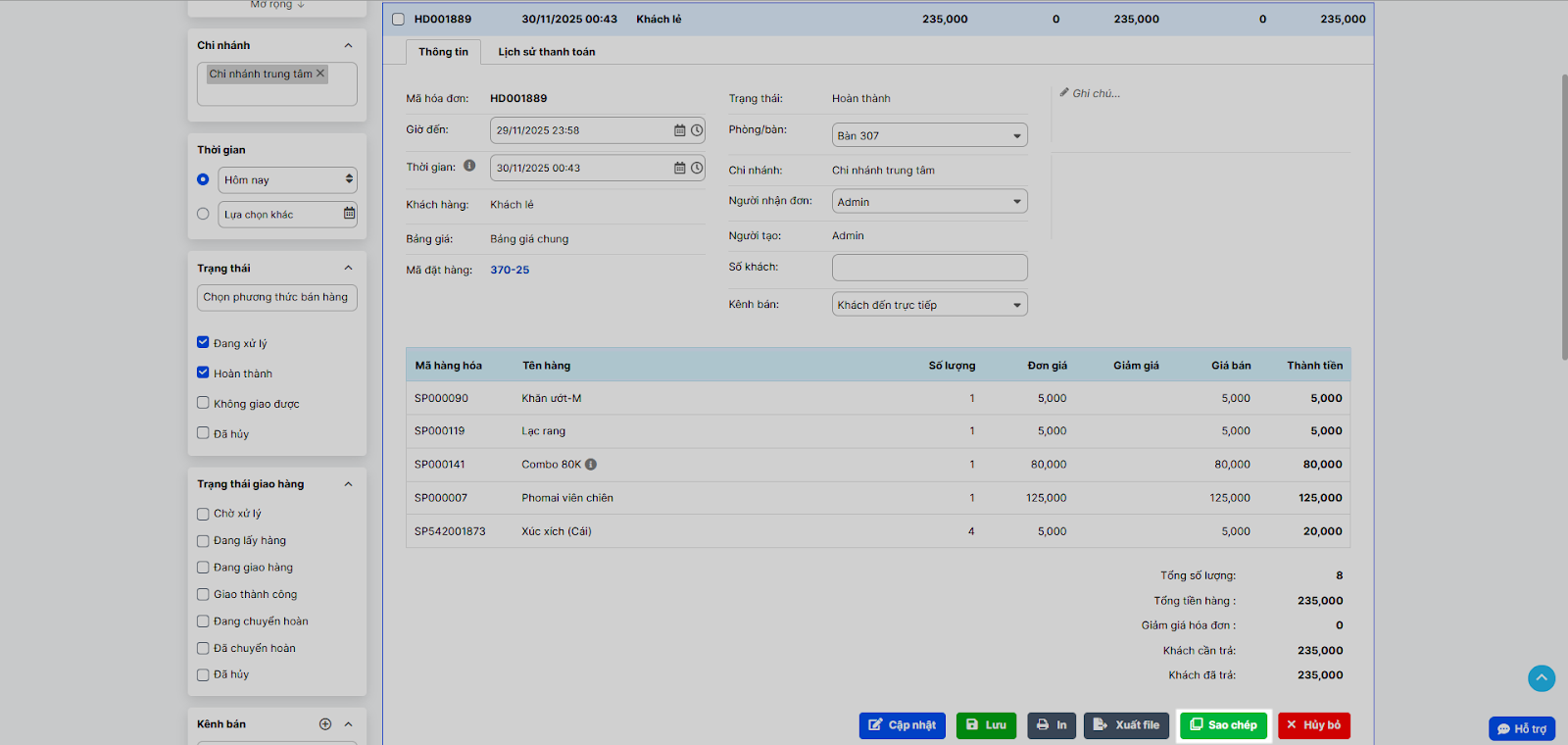 - Tình huống: Một đoàn khách đặt tiệc với các món ăn và số lượng y hệt một hóa đơn đã thanh toán trước đó. Bạn muốn tạo nhanh hóa đơn mới mà không cần chọn lại từ đầu.