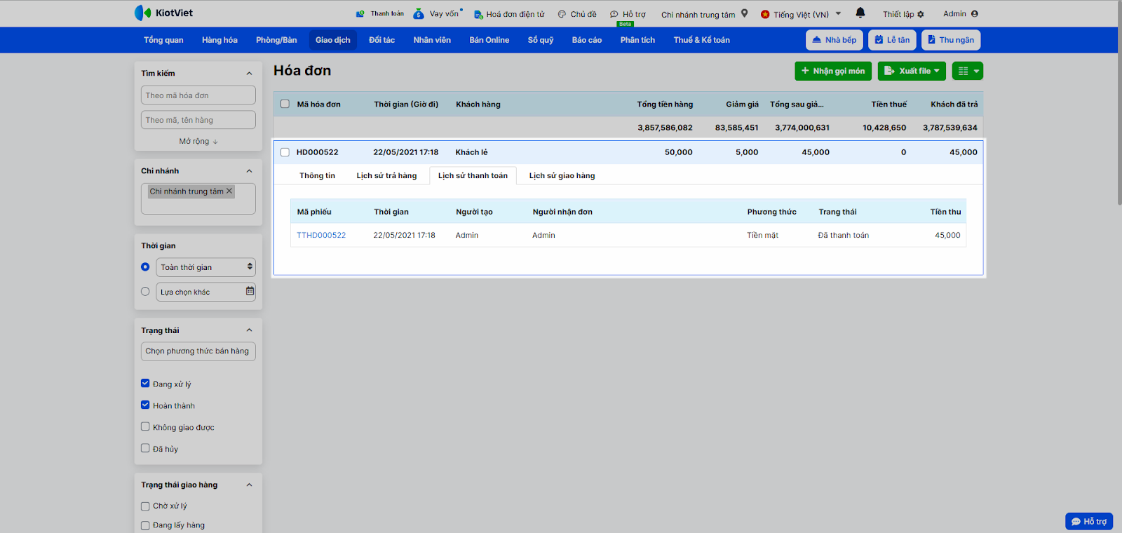 - Thời gian, trạng thái, phương thức thanh toán.