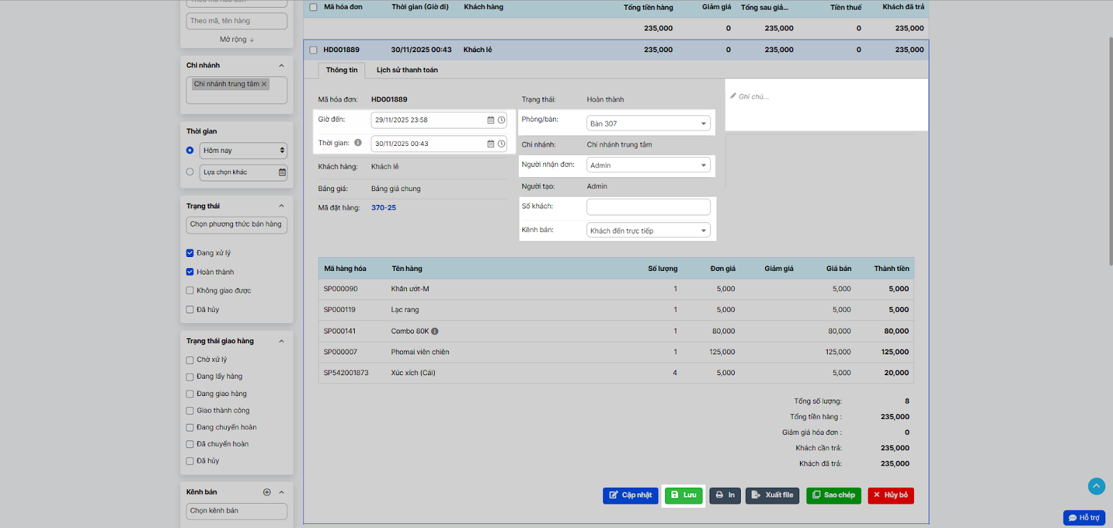 - Cập nhật các thông tin (Người nhận đơn, Kênh bán, Ghi chú) và nhấn Lưu.