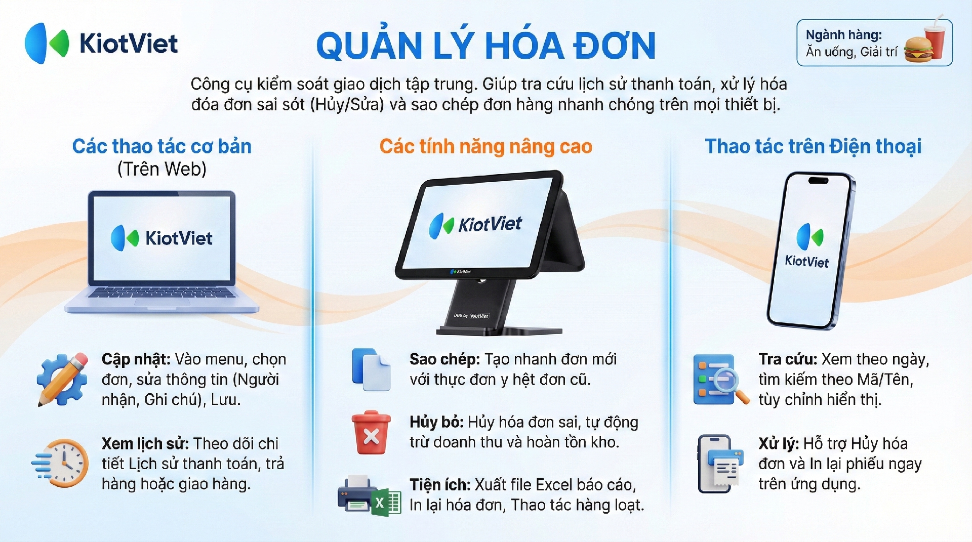 Tính năng quản lý Hóa đơn trên KiotViet cho phép bạn xem lại, tra cứu và thực hiện các thao tác nghiệp vụ (như cập nhật, hủy, sao chép, in ấn) đối với các hóa đơn đã được tạo từ màn hình thu ngân. Đây là công cụ quan trọng giúp quản lý nhà hàng kiểm soát doanh thu và xử lý các tình huống phát sinh sau bán hàng.