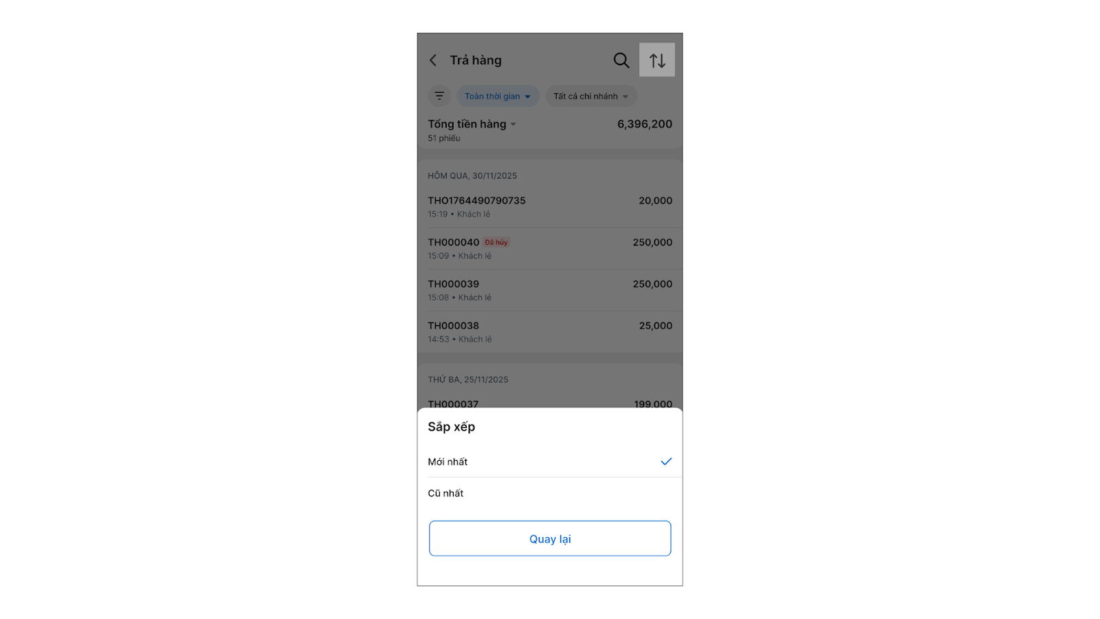 - Sắp xếp danh sách bằng cách nhấn vào tiêu đề các cột (Mã trả hàng, Thời gian, Khách hàng…).