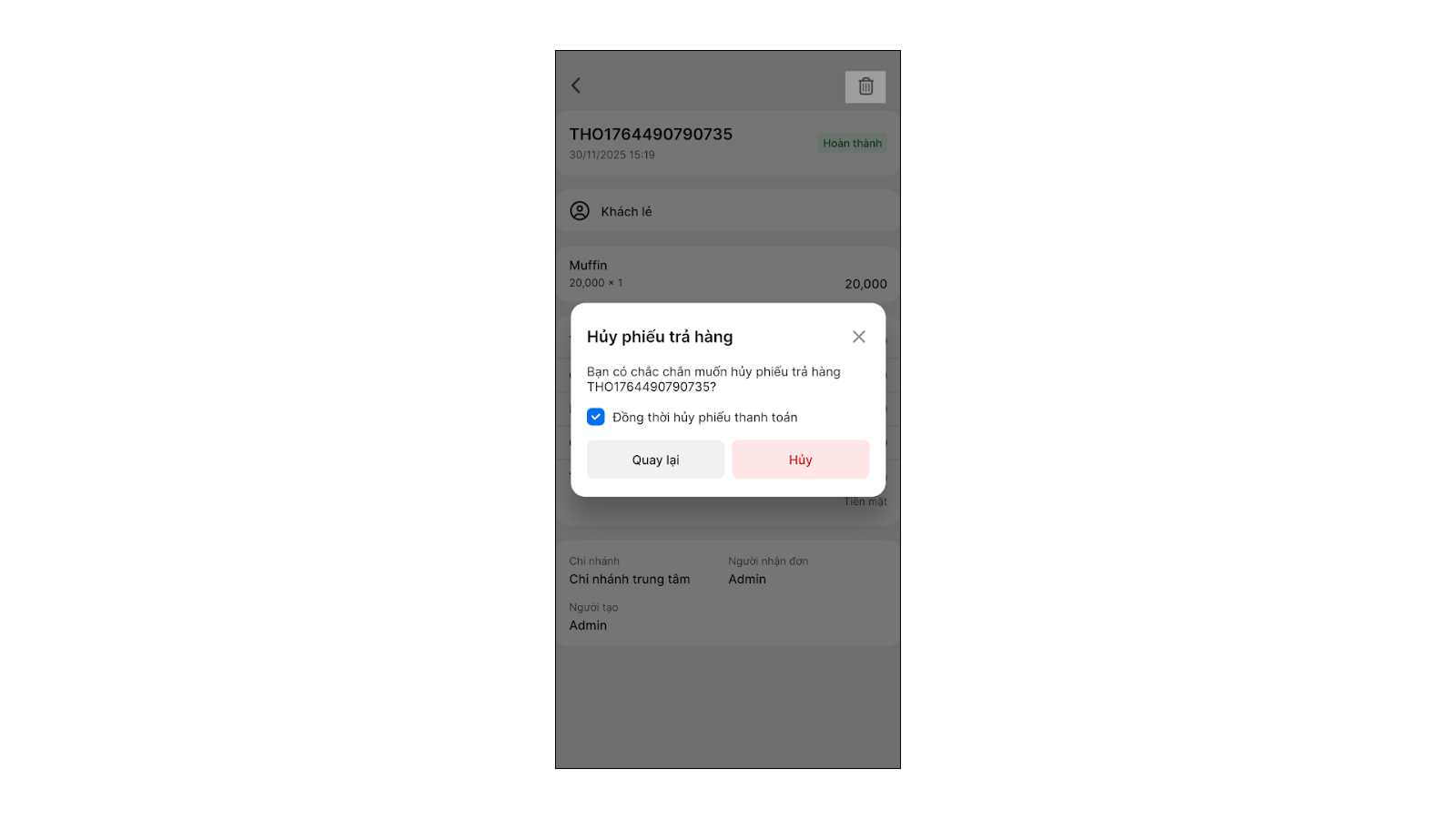 - Khi xem chi tiết phiếu trả hàng, bạn có thể hủy phiếu bị sai thông tin.