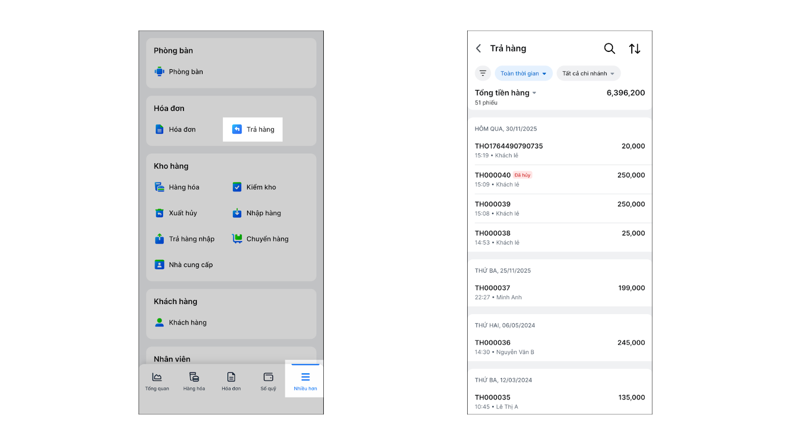 - Tình huống: Bạn muốn xem lại tất cả các phiếu trả hàng trong tháng này hoặc tìm một phiếu trả hàng theo tên khách hàng.
