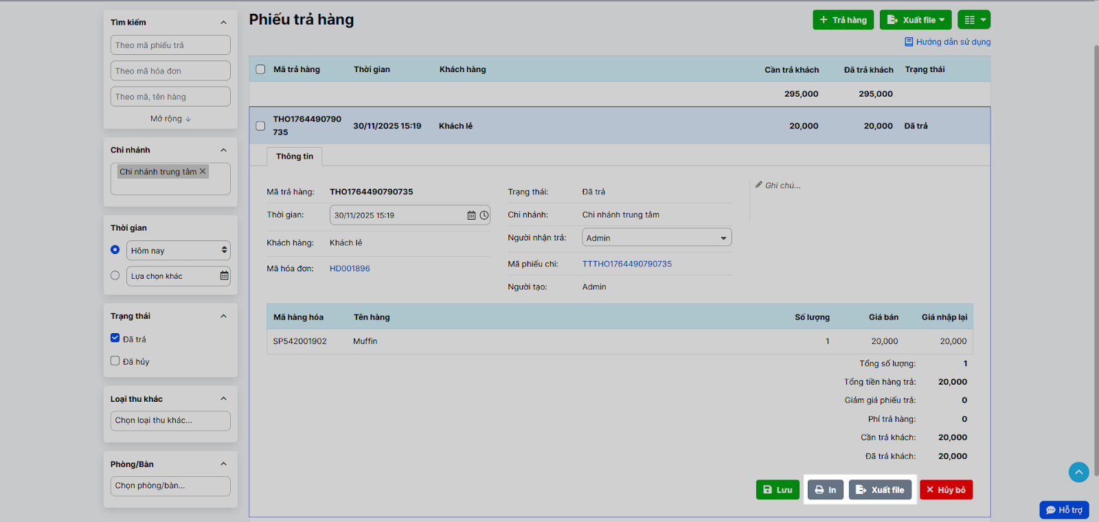 - Xem/in/xuất file (từng phiếu): Mở một phiếu trả hàng cụ thể để xem chi tiết, nhấn In để in, hoặc Xuất file để xuất chi tiết phiếu đó.