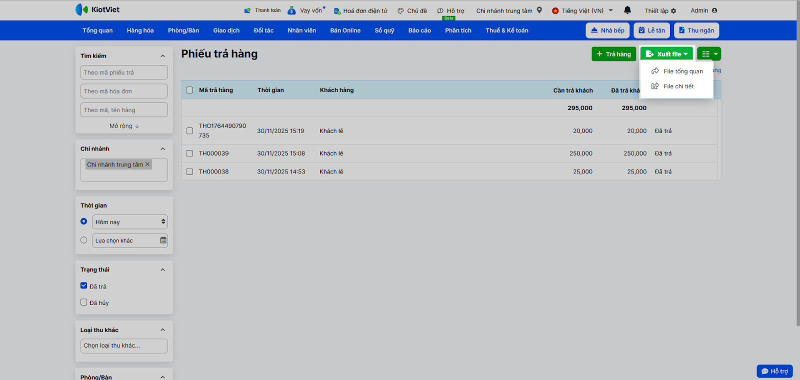 - Xuất file danh sách: Tại màn hình danh sách Phiếu trả hàng, nhấn Xuất file. Bạn có thể chọn File tổng quan (danh sách phiếu) hoặc File chi tiết (chi tiết hàng hóa trong các phiếu).