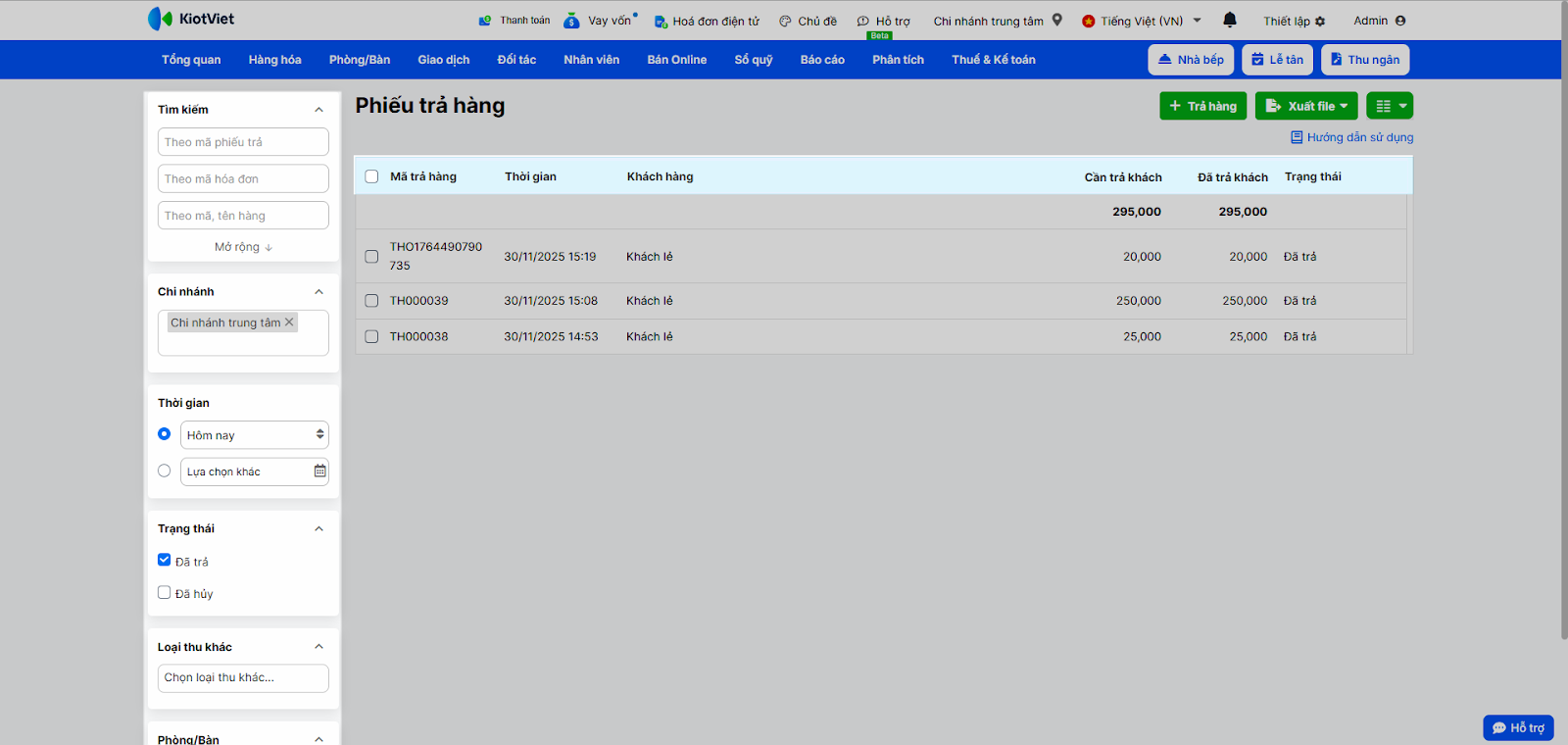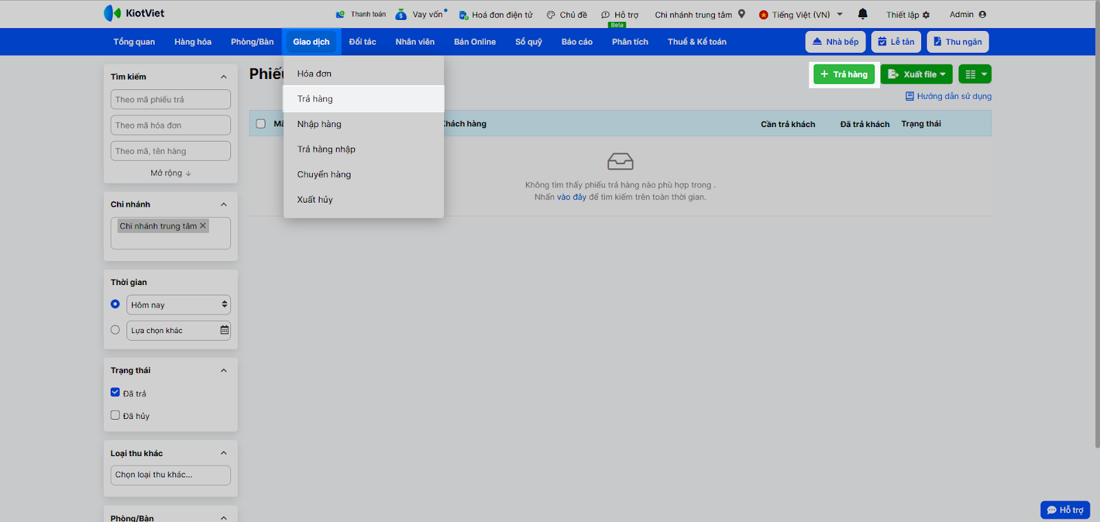 - Thao tác thực hiện như sau: Sử dụng các bộ lọc có sẵn để lọc theo: Thời gian, Chi nhánh, Trạng thái, hoặc tìm theo Mã phiếu trả, Mã hóa đơn, Tên/mã hàng, Thông tin khách hàng…