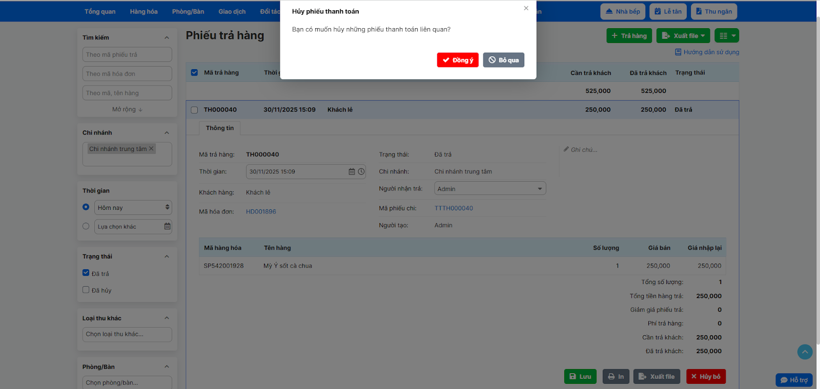 - Nếu phiếu trả hàng đó có phát sinh phiếu chi (hoàn tiền), hệ thống sẽ hỏi “Bạn có muốn hủy phiếu thanh toán liên quan không?”. Bạn nên chọn Đồng ý để hủy.