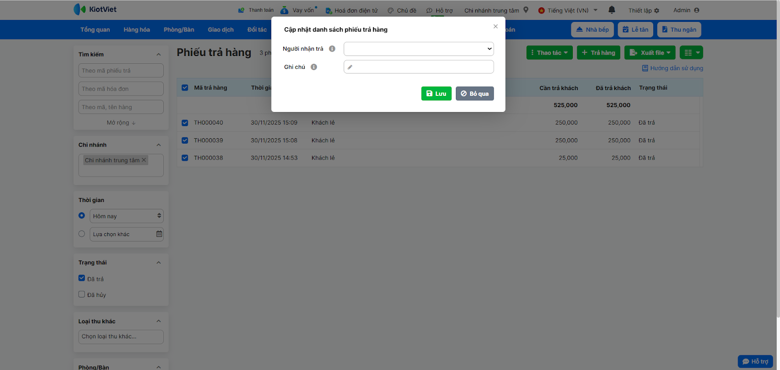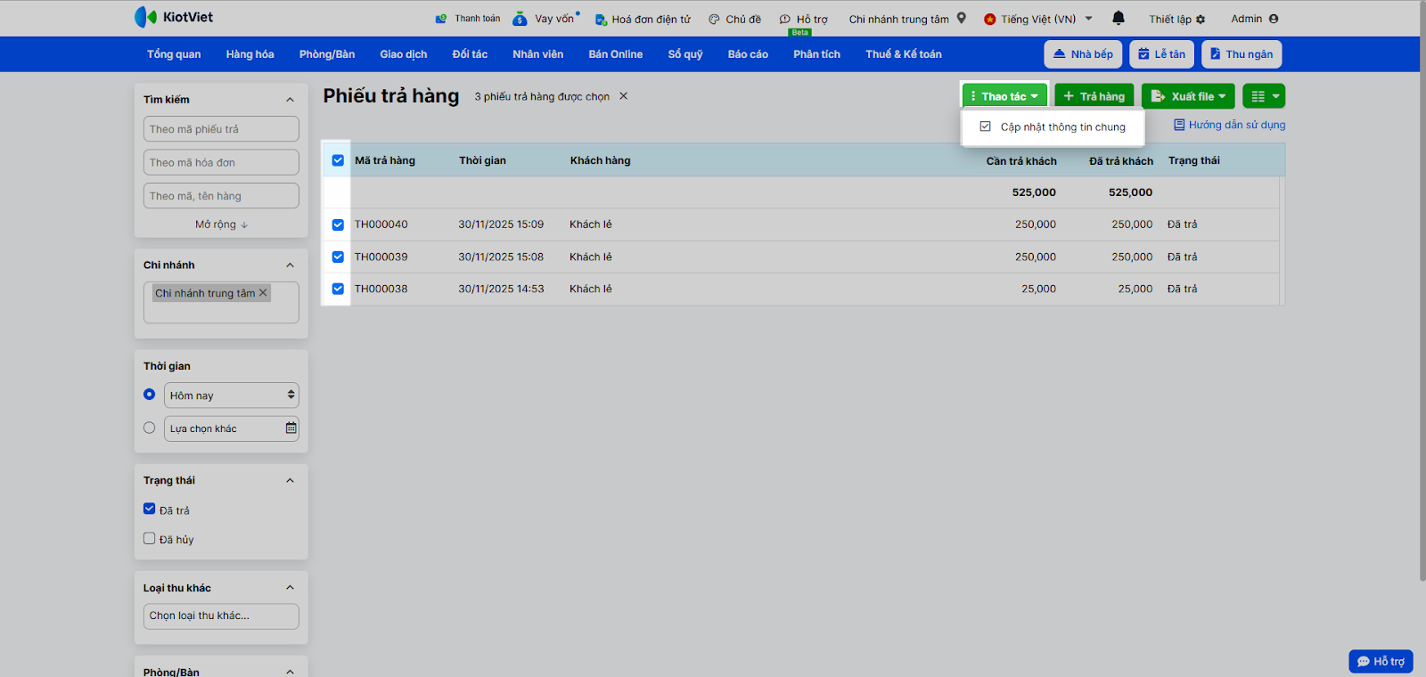 - Cập nhật hàng loạt: Tích chọn nhiều phiếu trả hàng, nhấn Thao tác → Cập nhật thông tin chung. Bạn có thể cập nhật nhanh Người nhận trả và Ghi chú cho tất cả phiếu đã chọn.