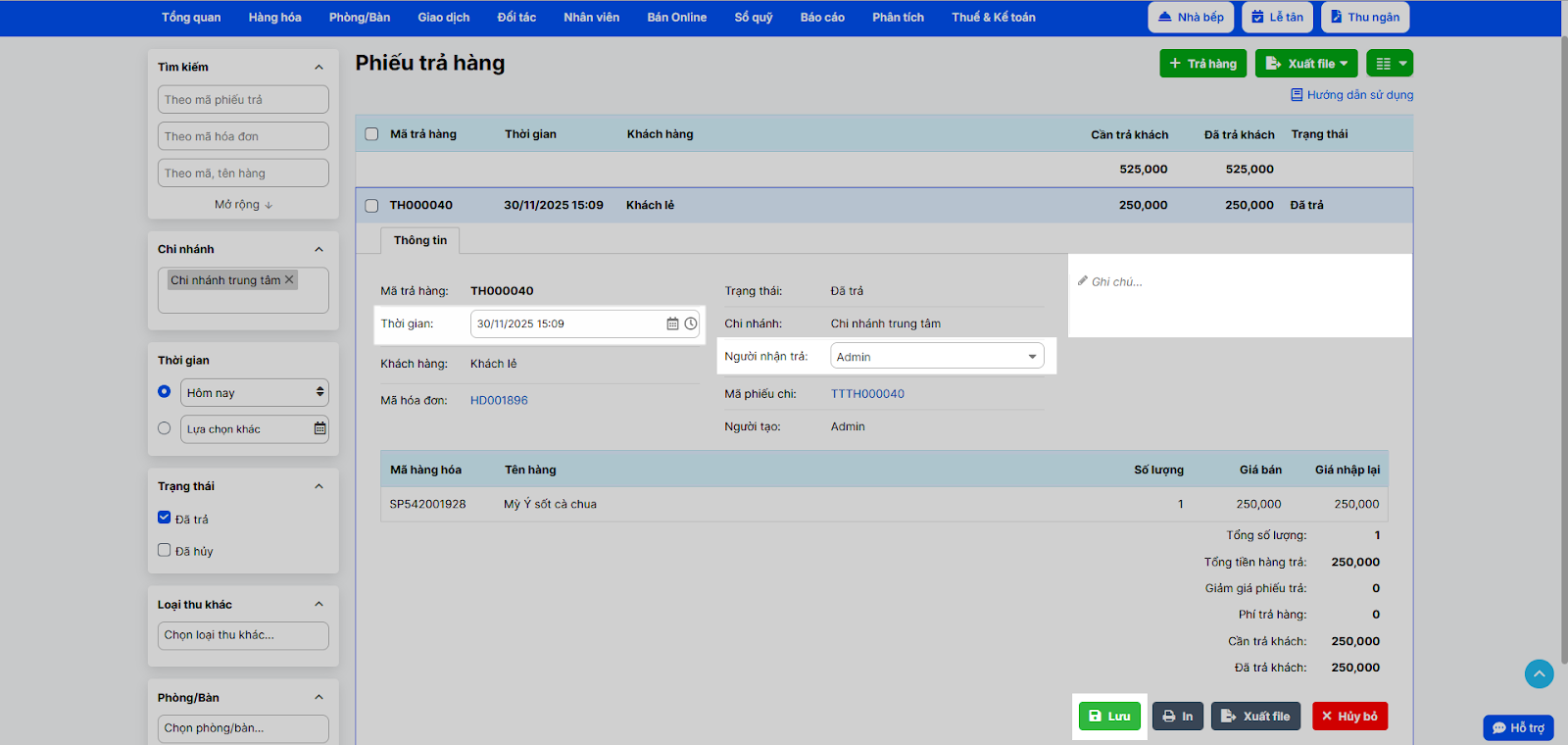 - Cập nhật từng phiếu: Vào Giao dịch → Trả hàng, chọn phiếu cần sửa. Bạn chỉ có thể thay đổi các thông tin như: Người nhận trả, Thời gian, Ghi chú. Nhấn Lưu sau khi hoàn tất.