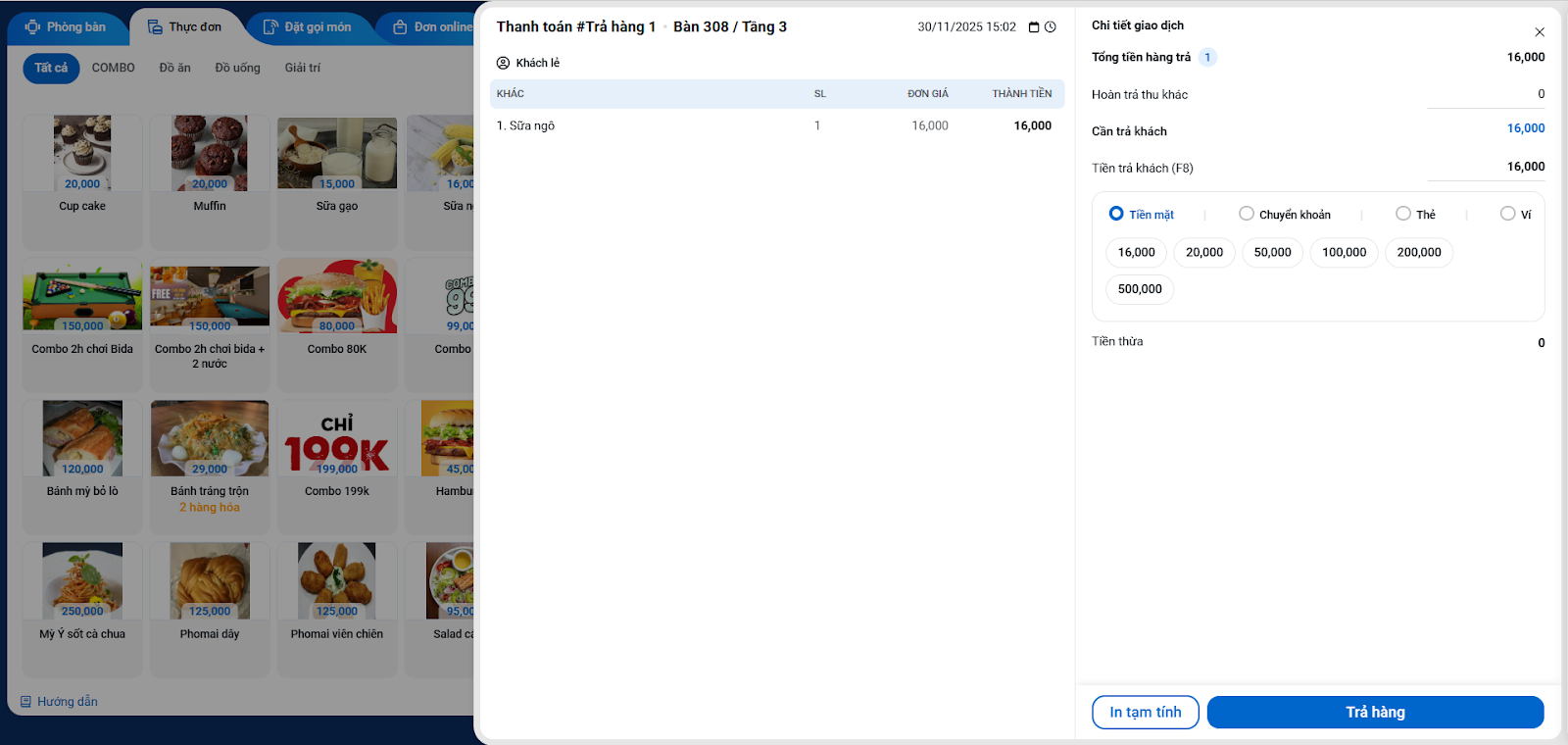 - Tìm và thêm Sữa ngô vào phiếu, nhập số lượng là 1 và nhập đơn giá trả lại cho khách.