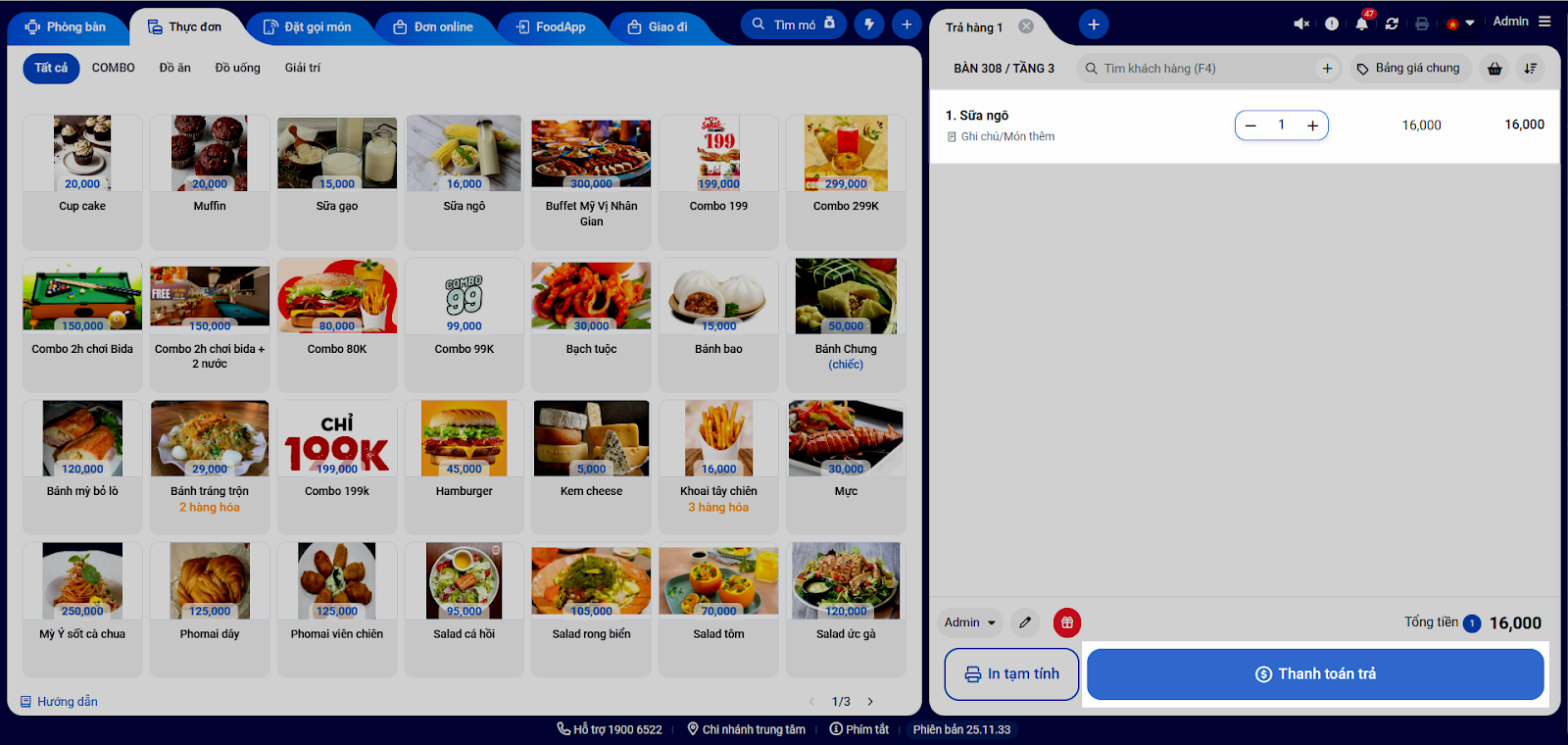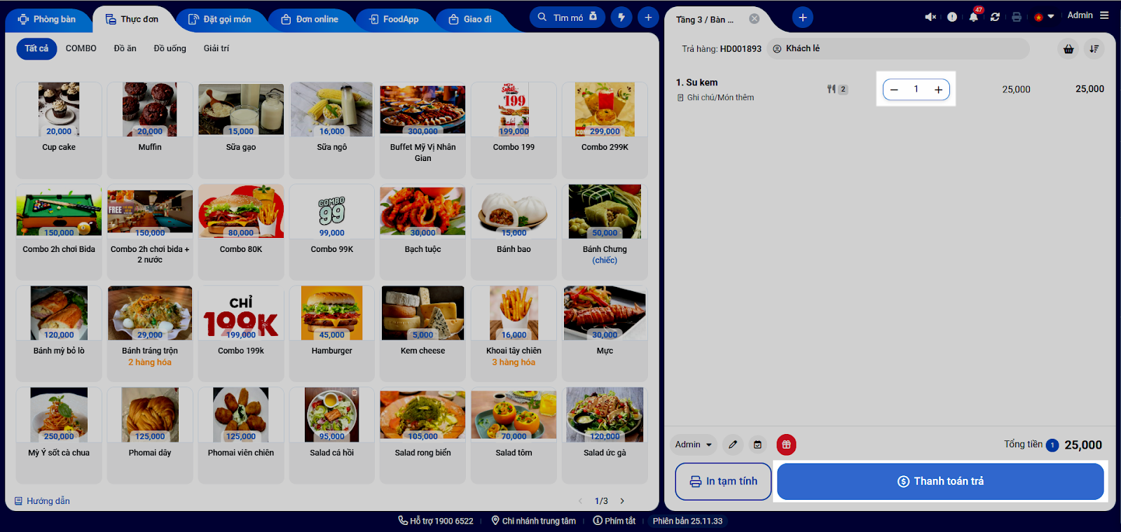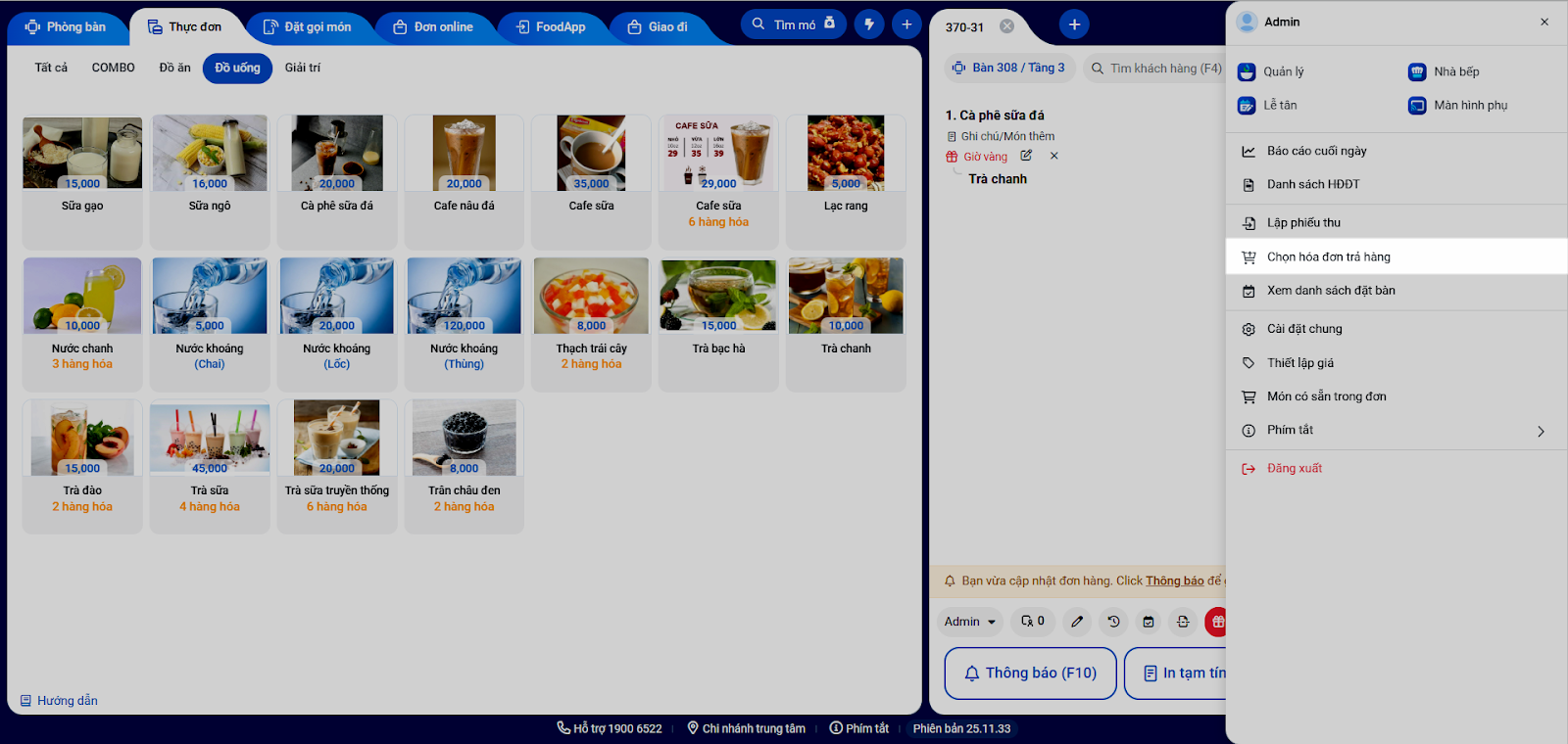 - Hệ thống hiển thị các món trong hóa đơn. Bạn cập nhật số lượng trả là 1.