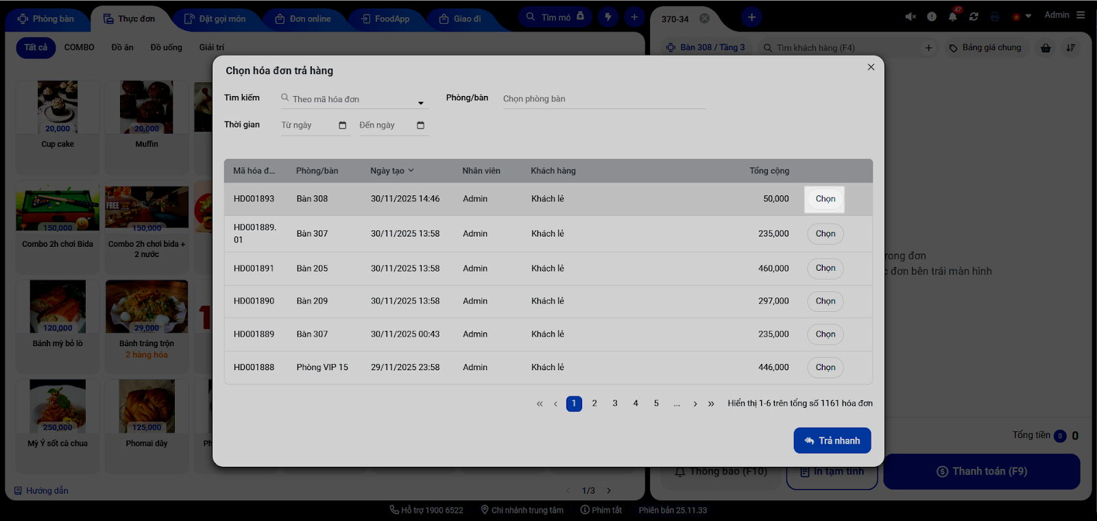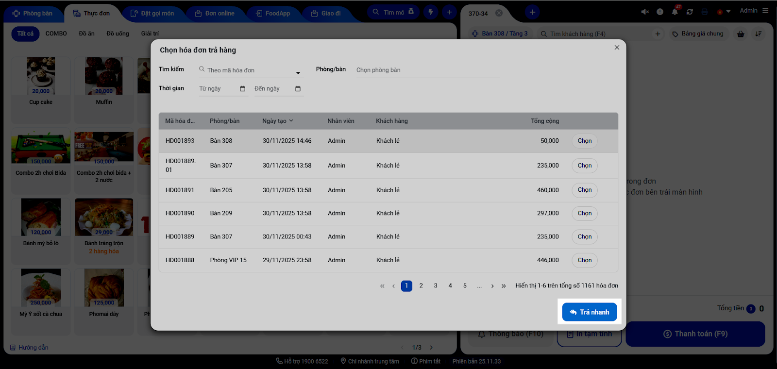 - Hệ thống hiển thị cửa sổ Chọn hóa đơn trả hàng → nhấn nút Trả nhanh.