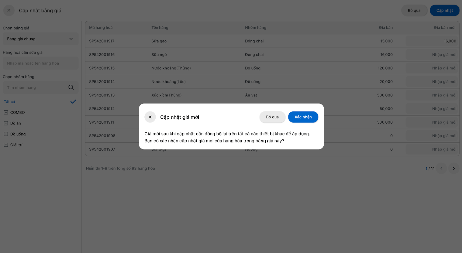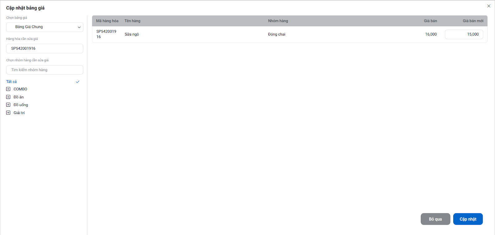 - Hệ thống mở ra màn hình Cập nhật bảng giá → nhập giá trị vào ô Giá bán mới (đây là giá niêm yết sẽ áp dụng cho cả các lần bán sau).