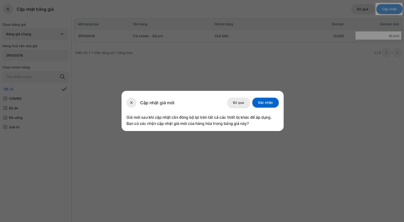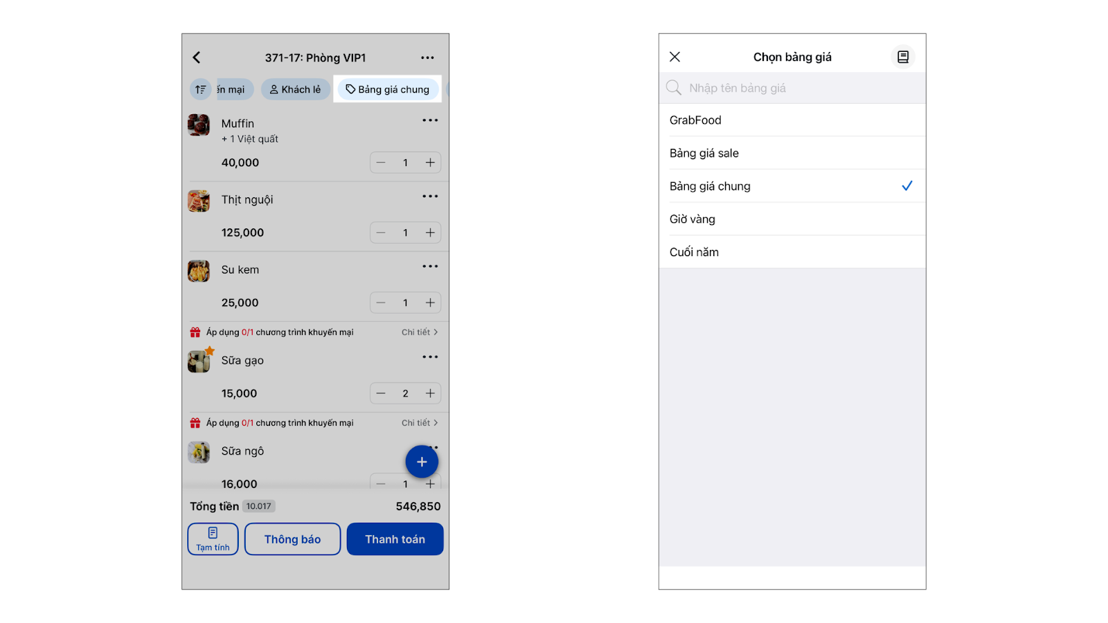 - Cập nhật bảng giá: Chọn lại bảng giá cần áp dụng (ví dụ: giá phòng VIP, giá ưu đãi…). Lưu ý: Nhân viên Bồi bàn thường không có quyền này.