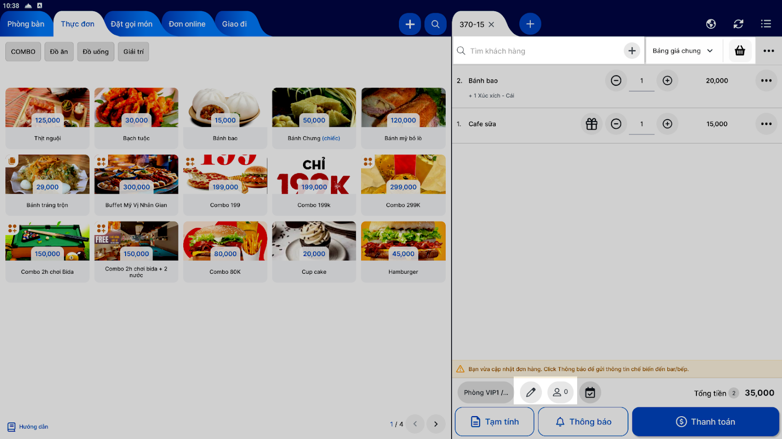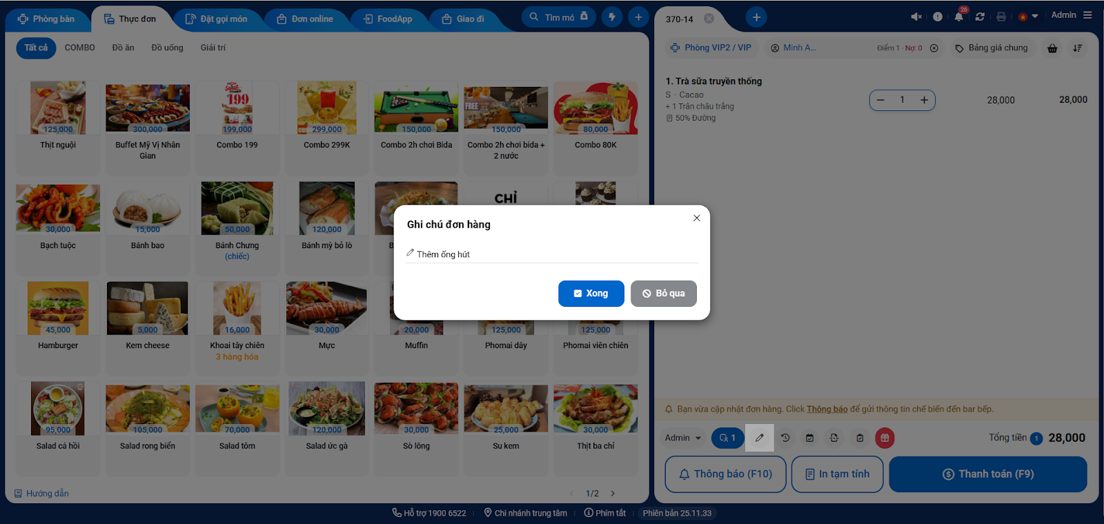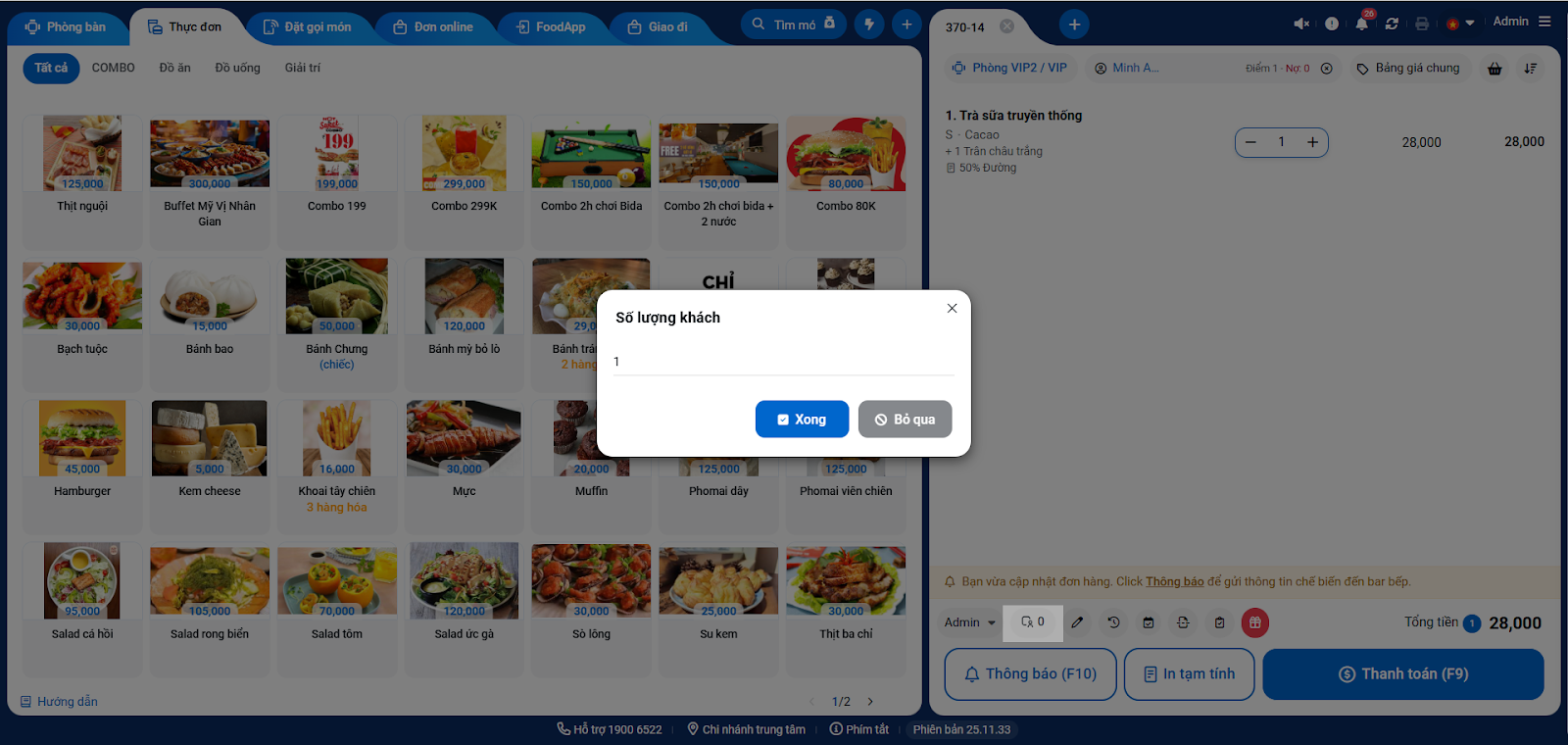 - Tình huống: Bạn cần gắn thông tin khách hàng quen vào đơn, thay đổi số lượng khách tại bàn, hoặc cập nhật ghi chú chung cho đơn.