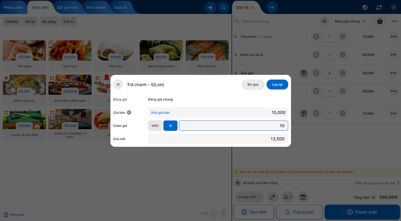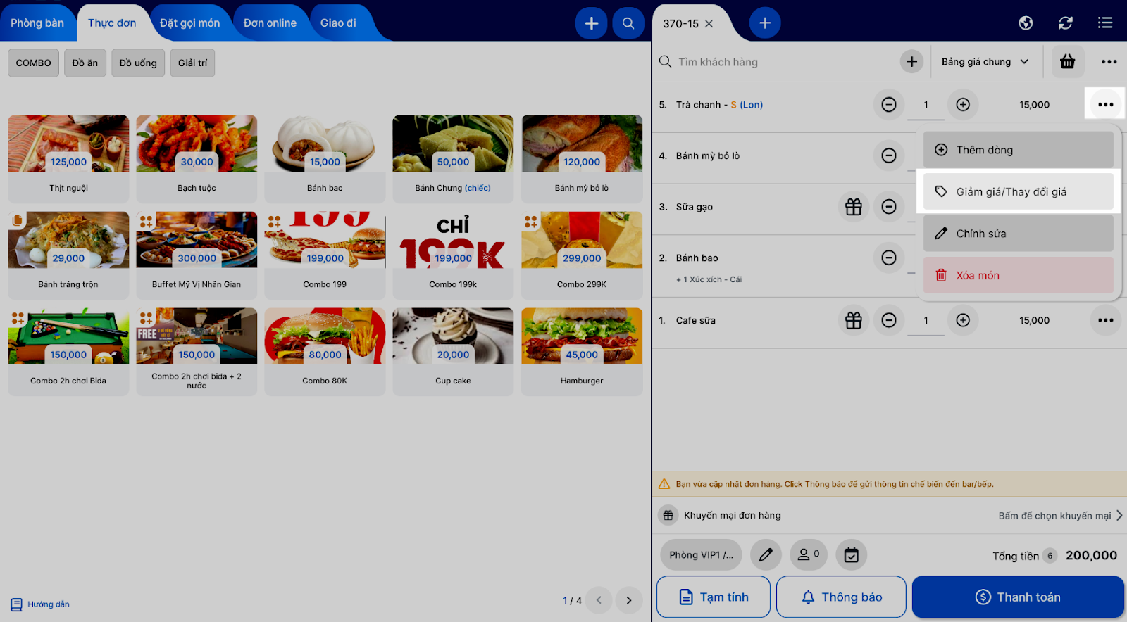 1. Điều chỉnh giá bán hoặc giảm giá (cho từng món)