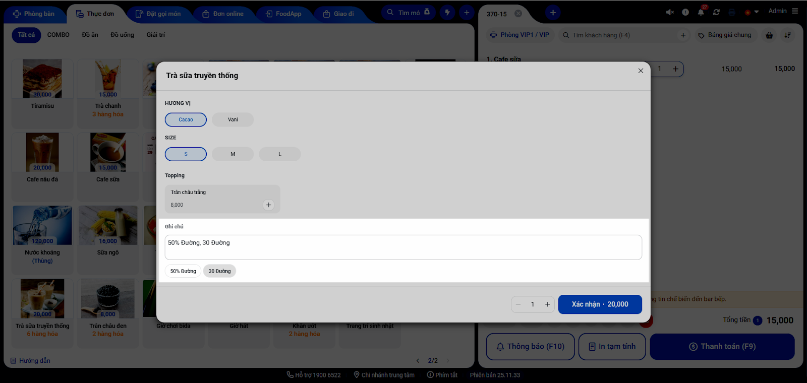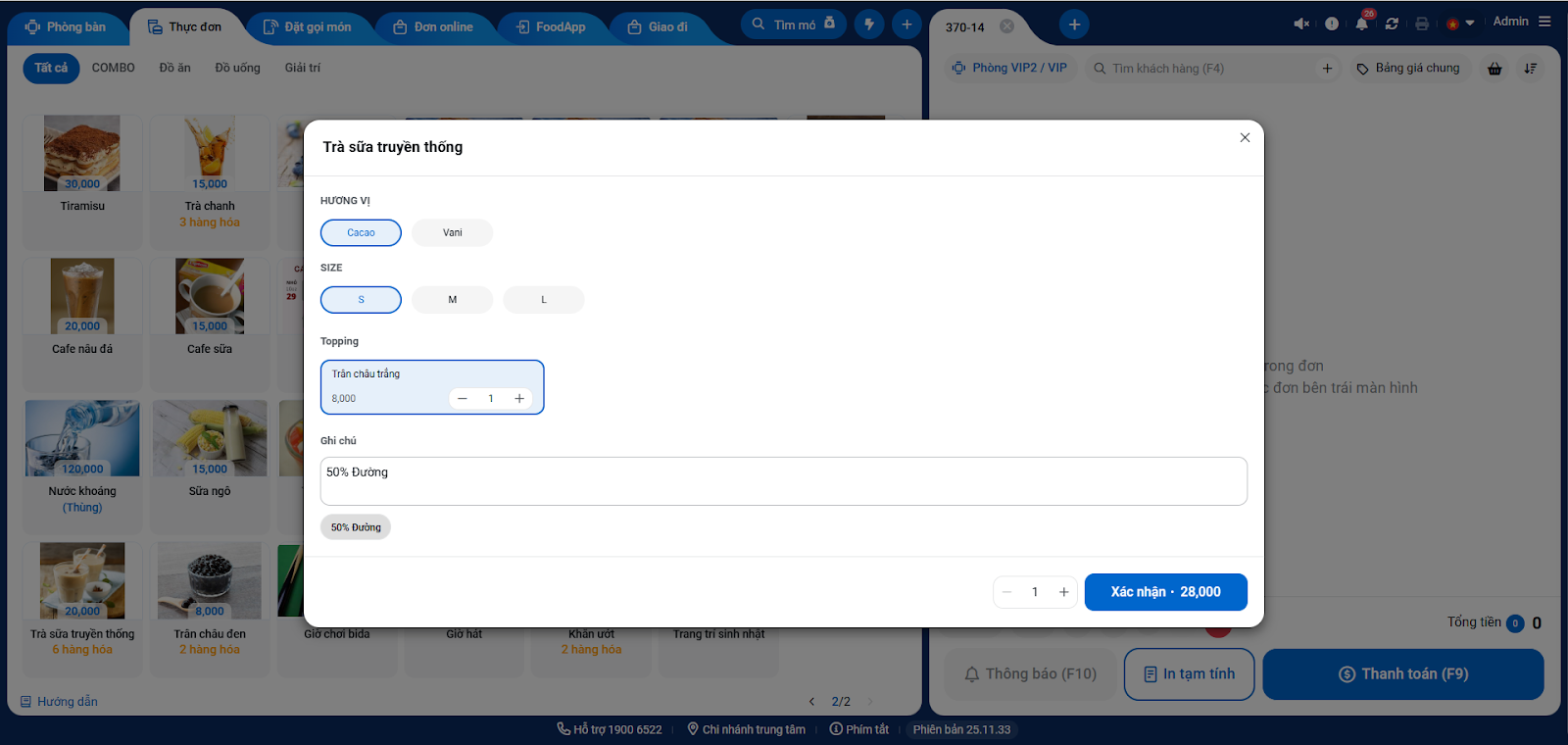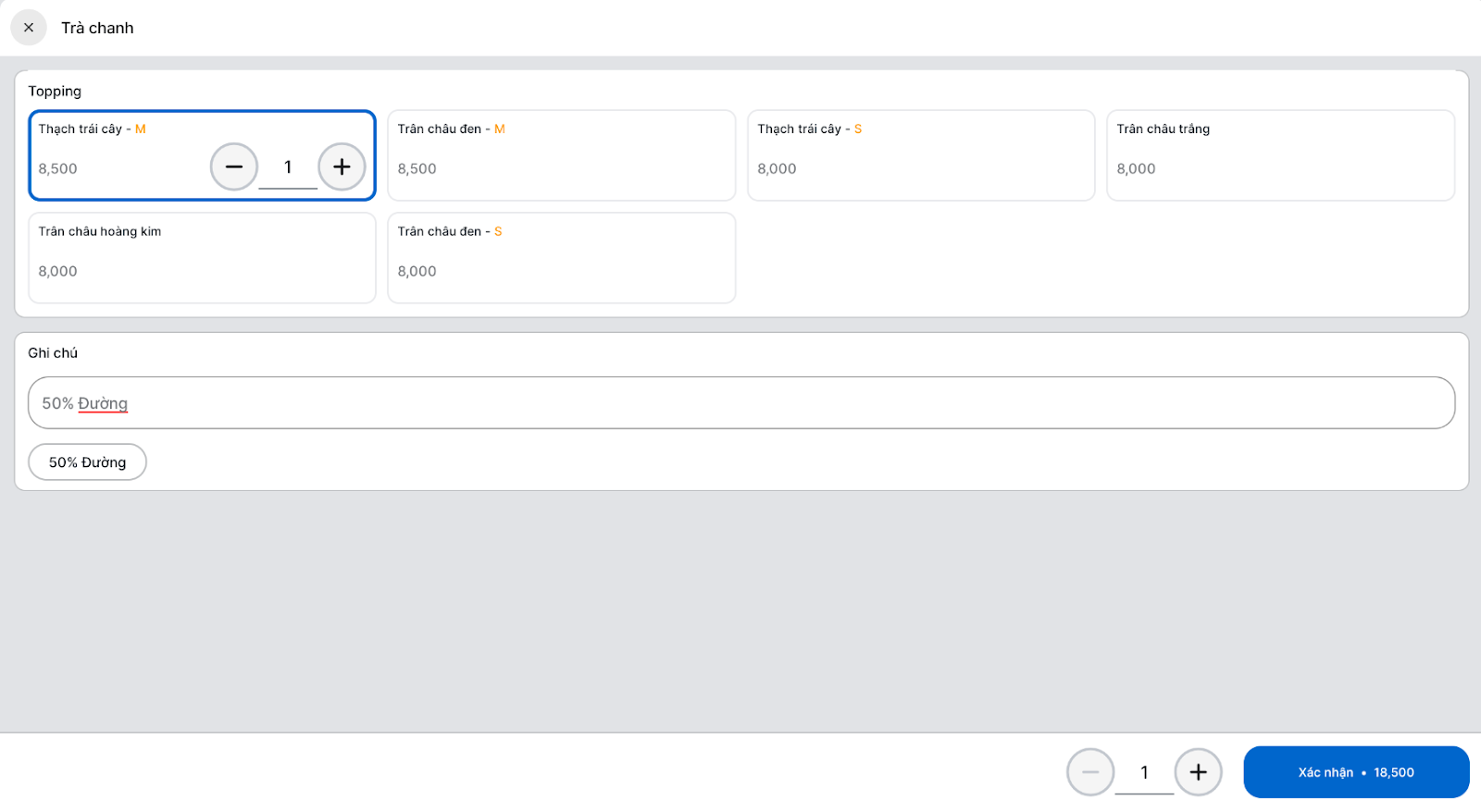 - Chọn các món thêm (topping) có sẵn hoặc nhập ghi chú riêng (ví dụ: “ít cay”, “50% Đường”).