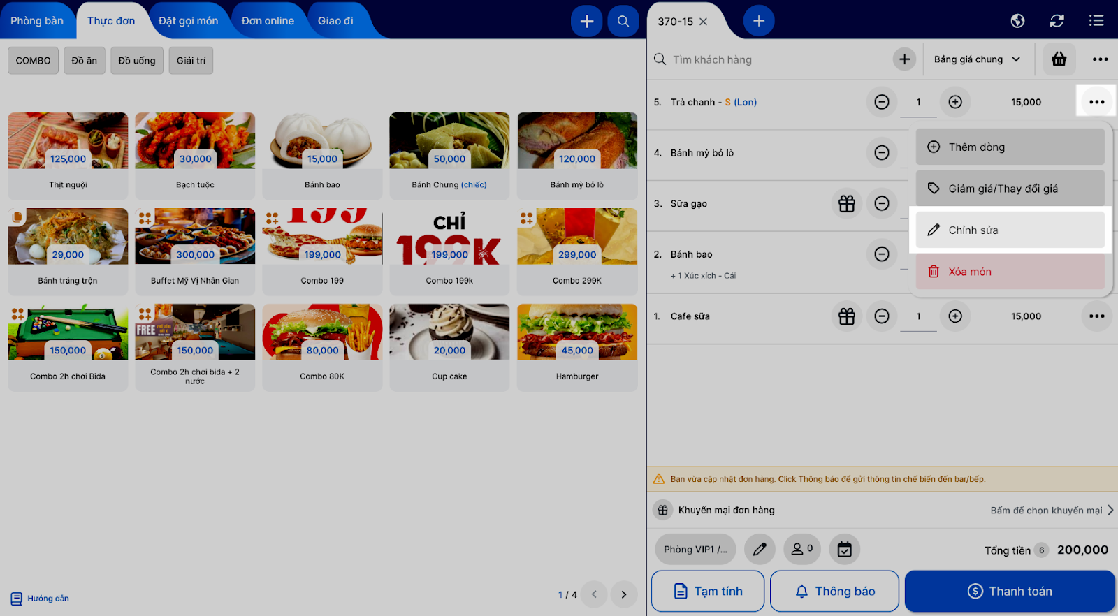 - Thay đổi Số lượng, Giá, Ghi chú: Chạm vào chi tiết món, thay đổi thông tin → chạm Lưu.