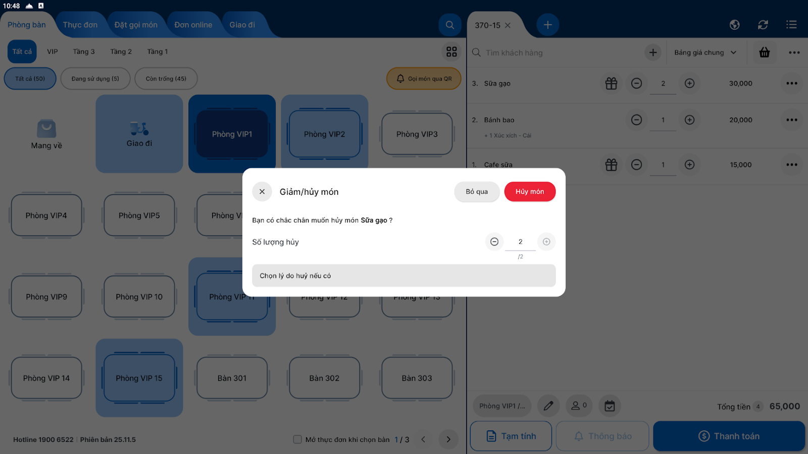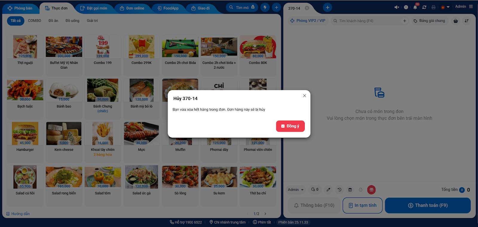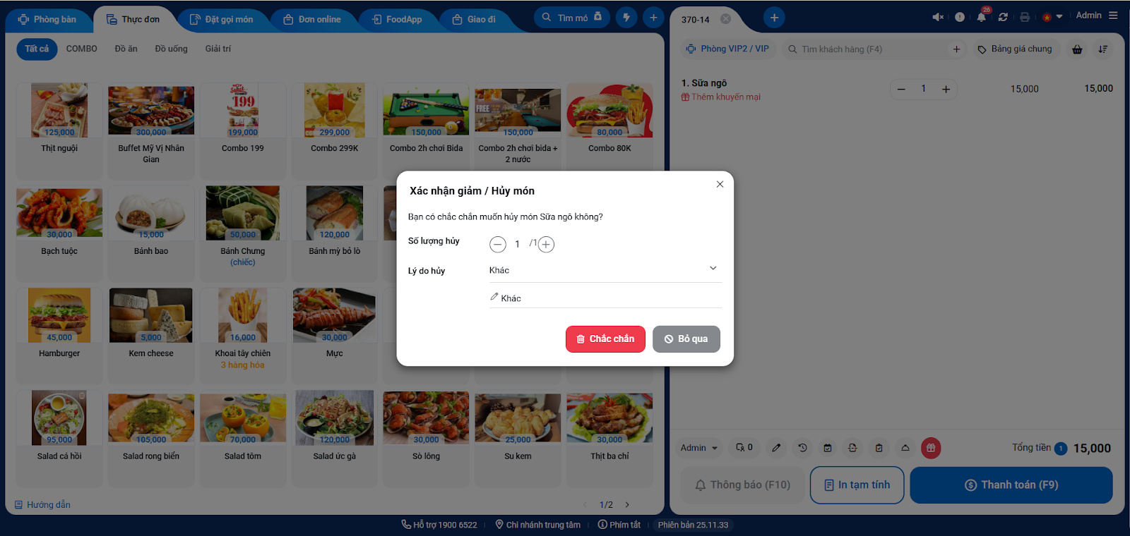 - Với món chưa thông báo bếp: Hủy trực tiếp.