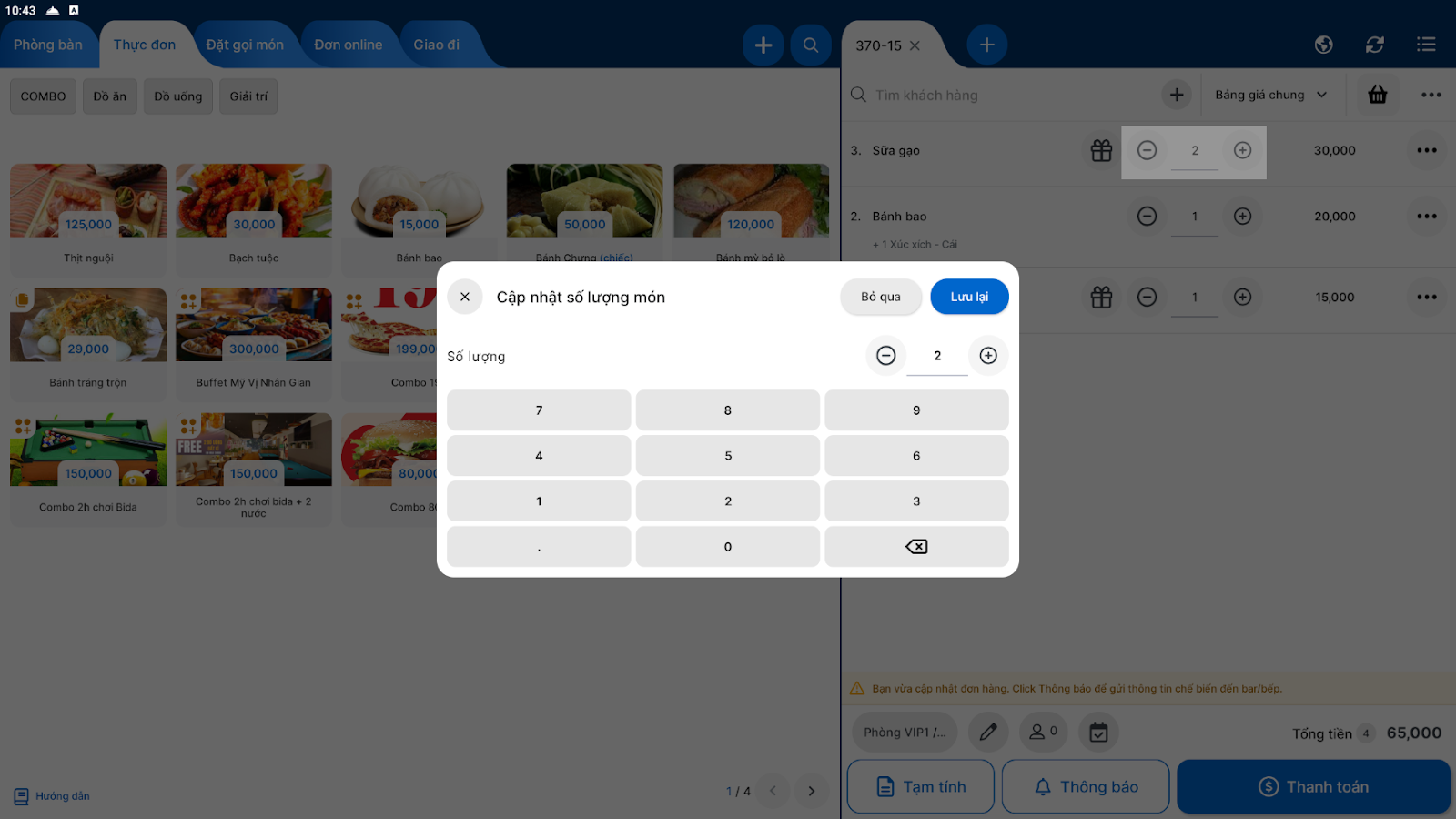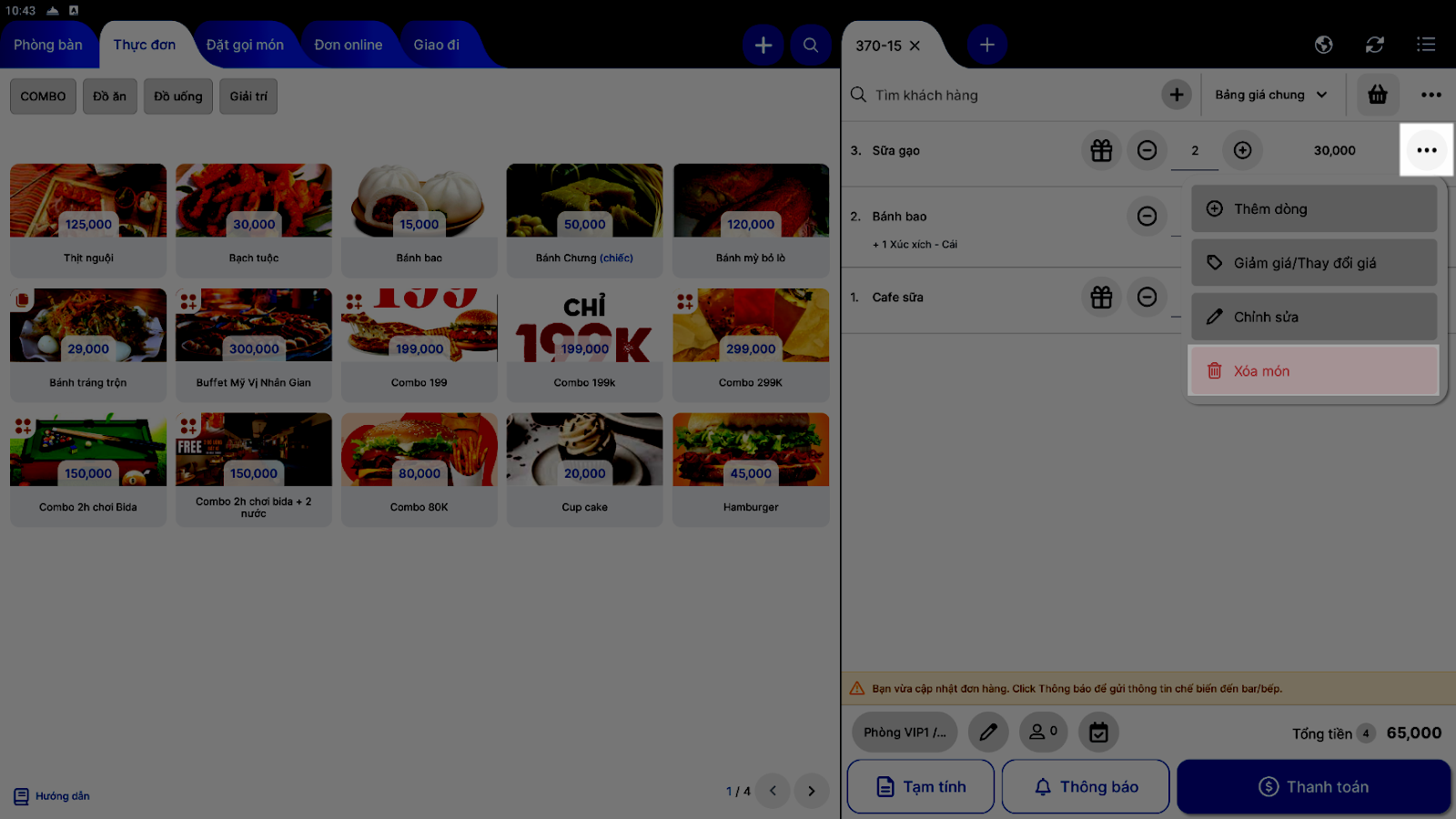 3. Tăng – Giảm số lượng hoặc Hủy món