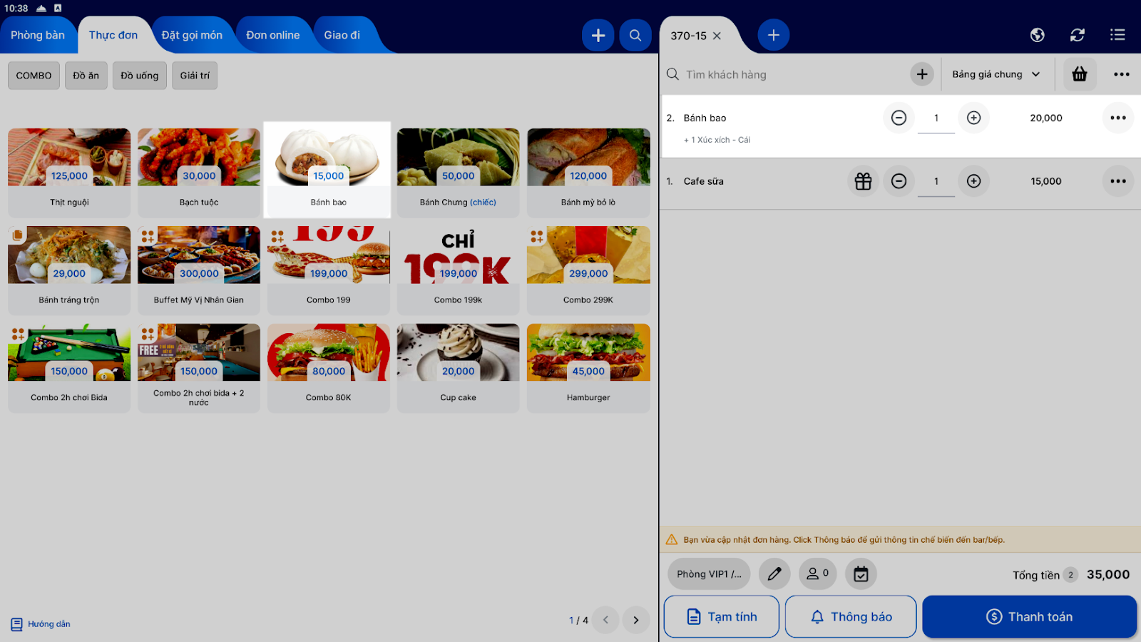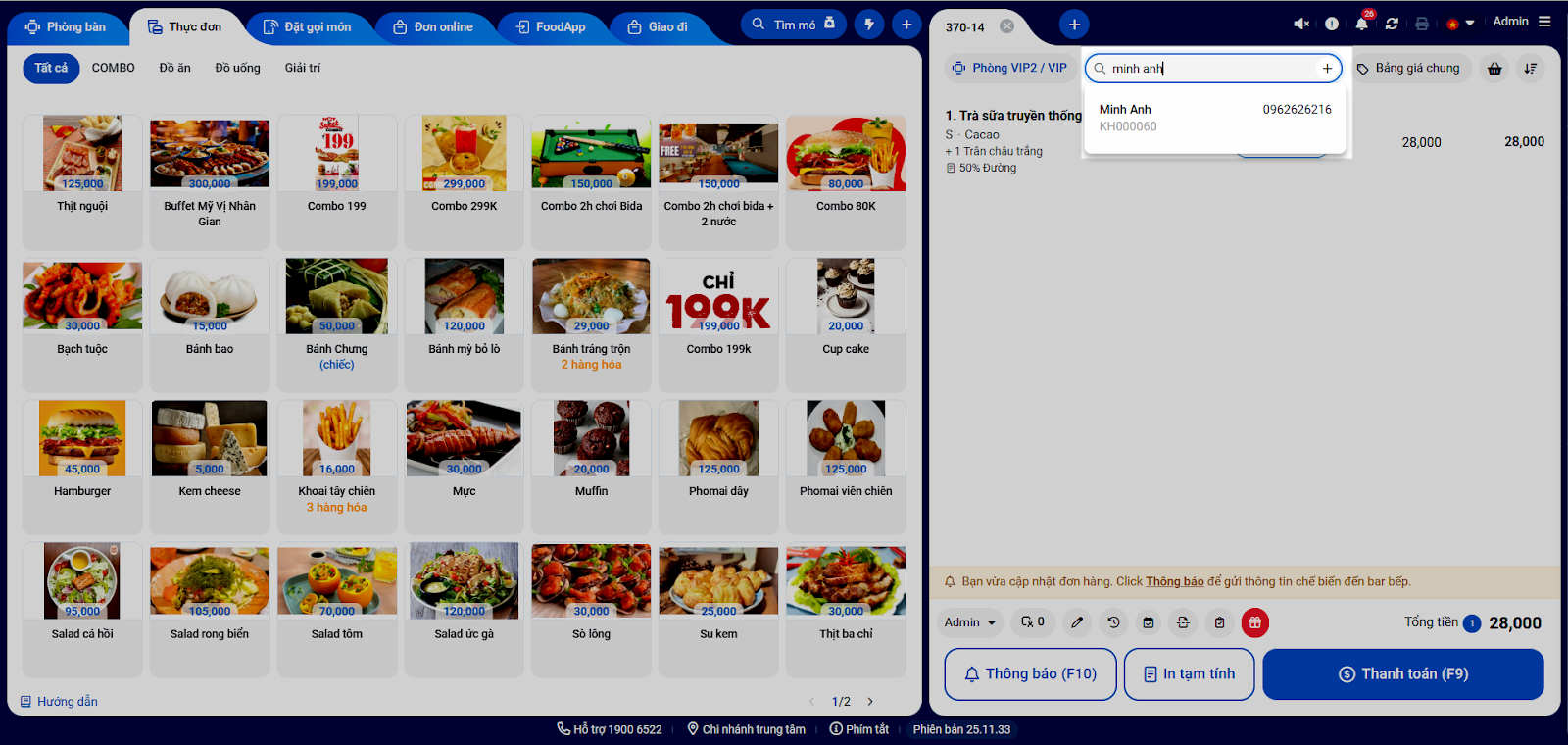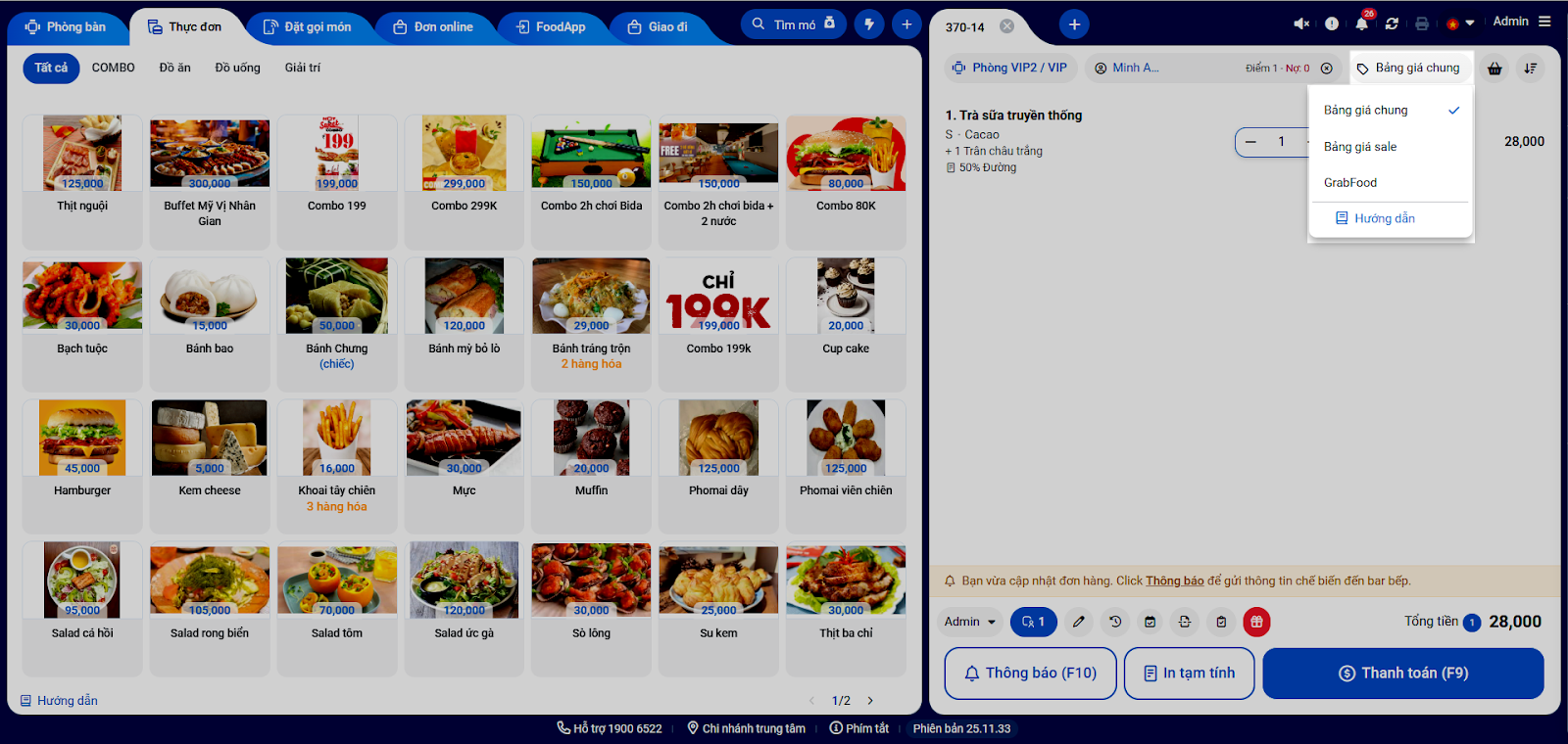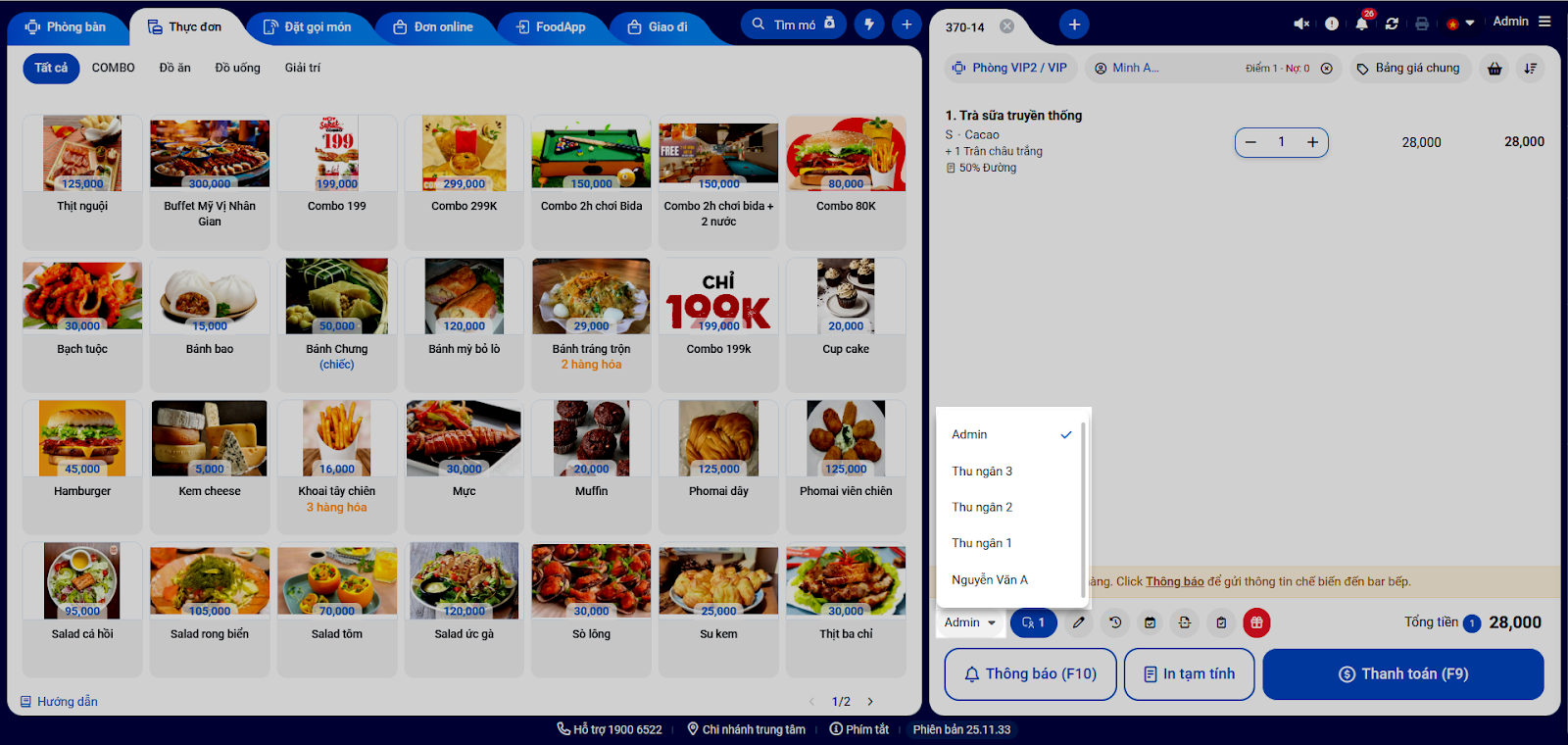 - Sử dụng tab Thực đơn, lọc theo nhóm hoặc tìm kiếm món.