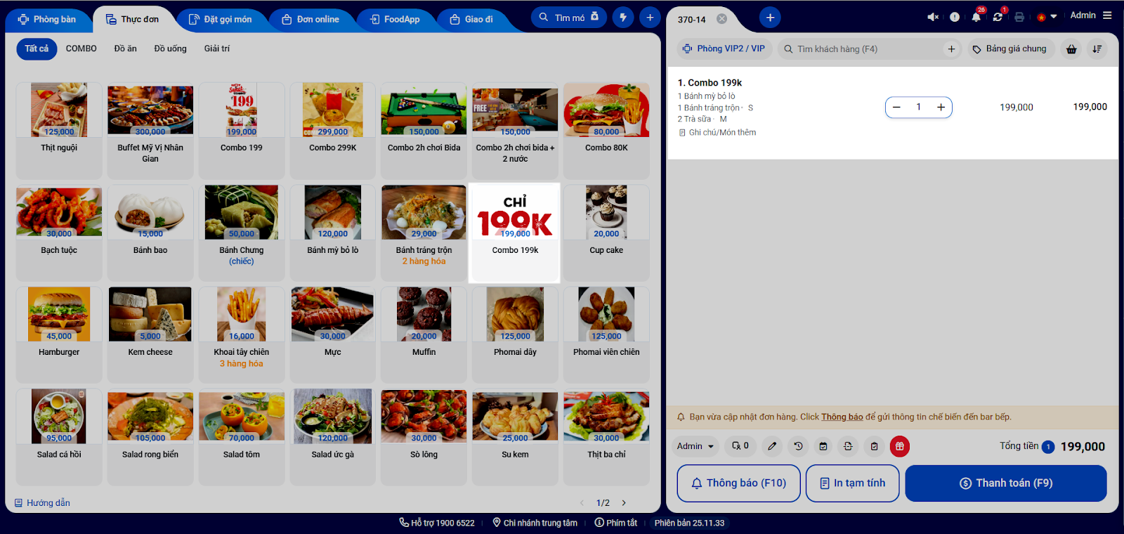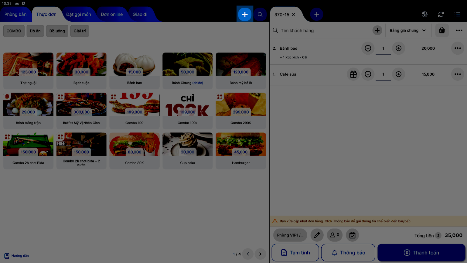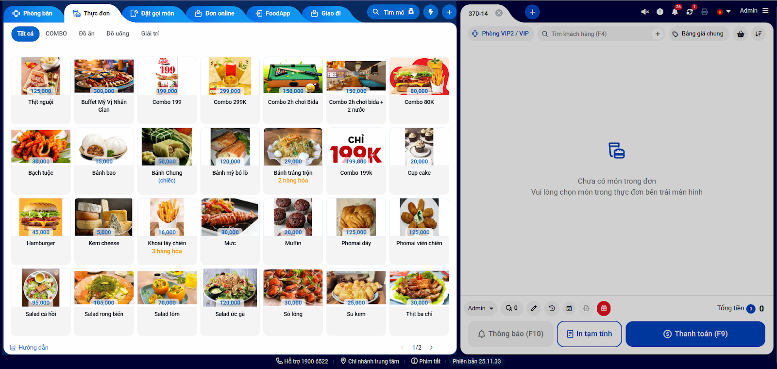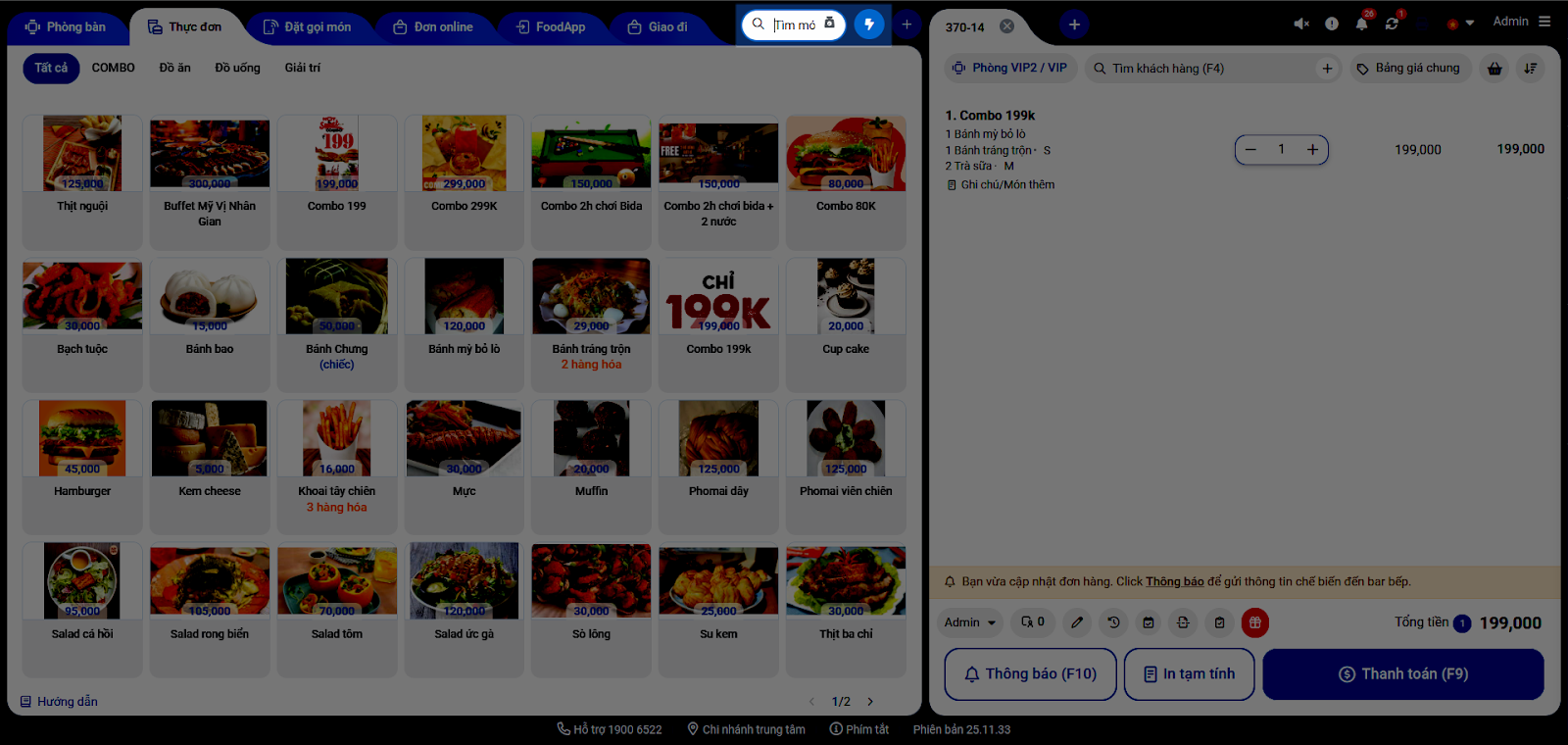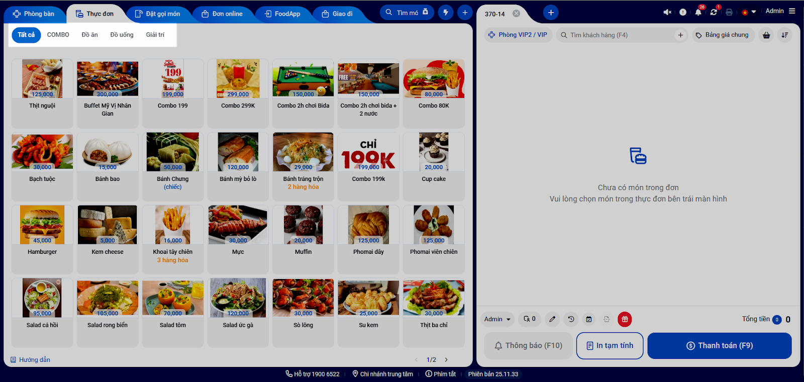 - Sử dụng tab Thực đơn, lọc theo nhóm hoặc tìm kiếm món.