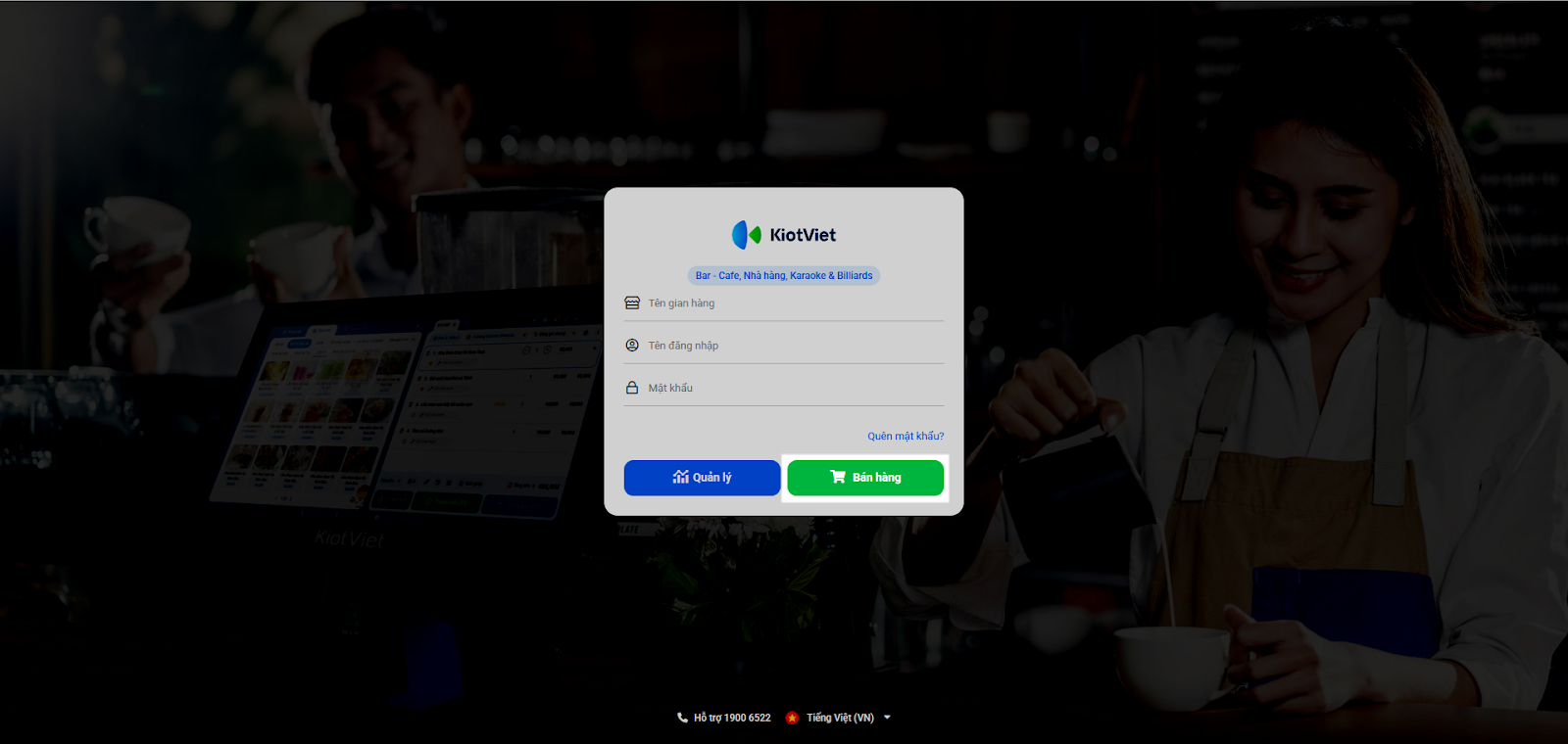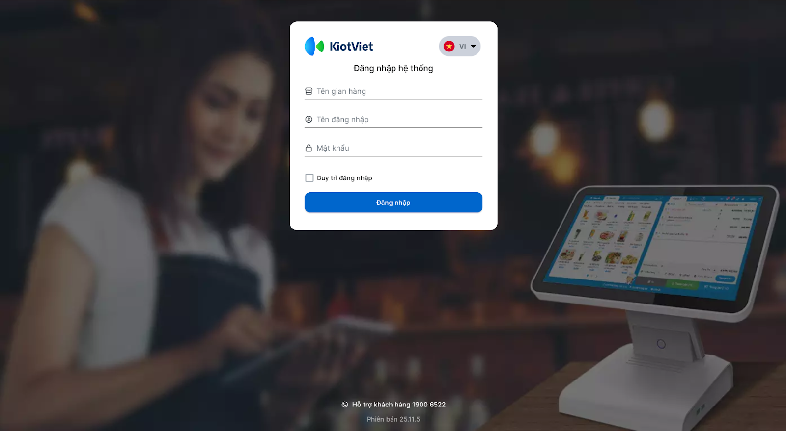 - Đăng nhập: Mở ứng dụng KiotViet Máy POS Nhà hàng và đăng nhập bằng tài khoản của bạn.