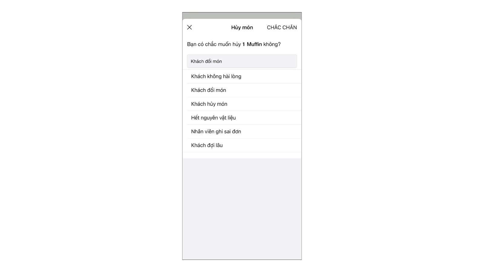 - Nếu đơn đã thông báo bếp, hệ thống sẽ yêu cầu bạn Nhập lý do hủy món và chạm Chắc chắn để xác nhận hủy.