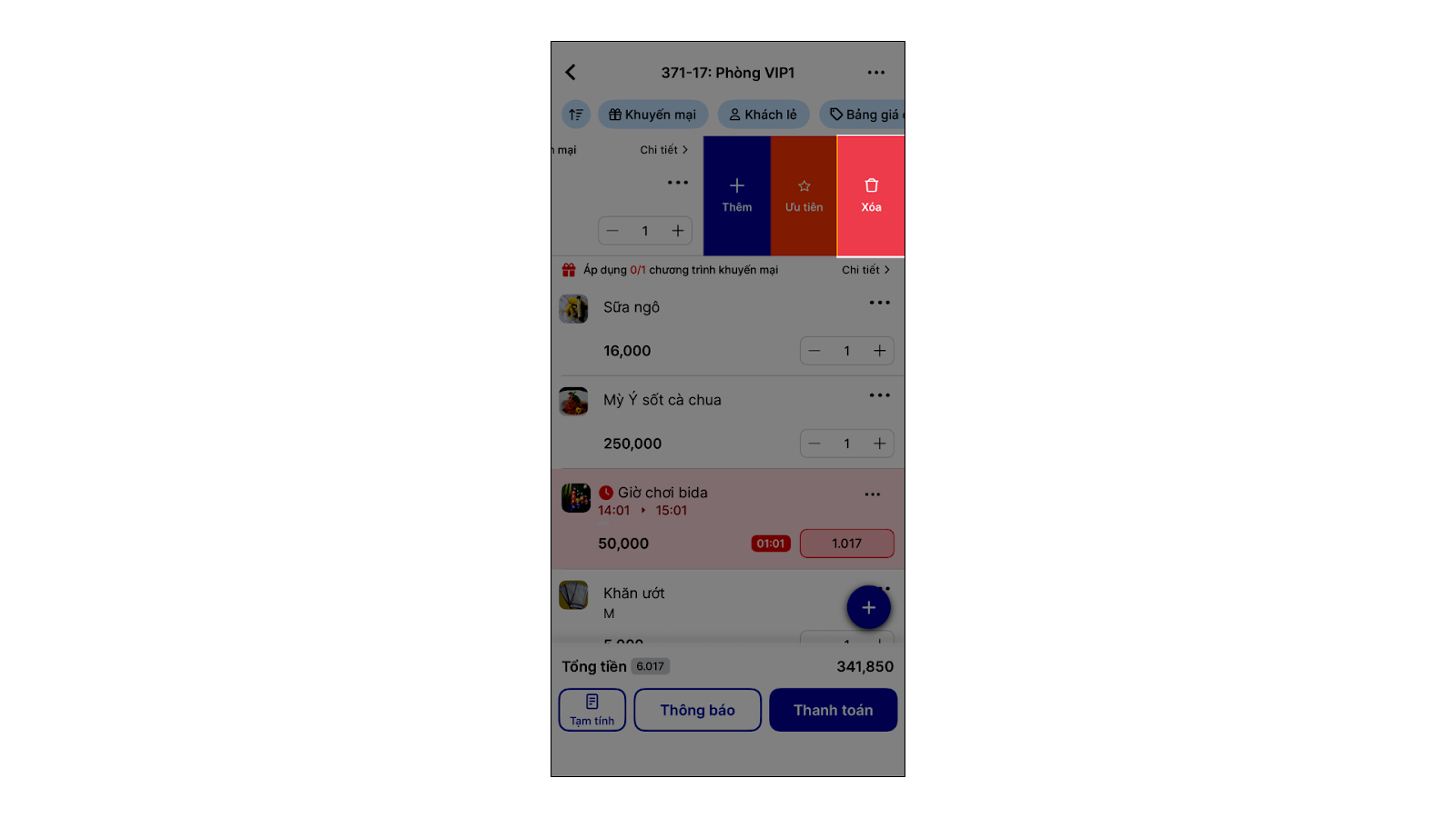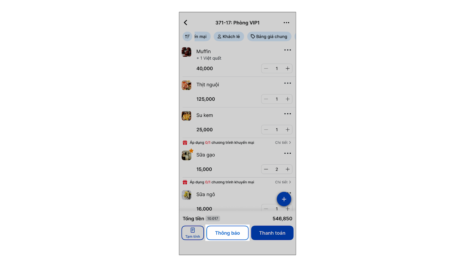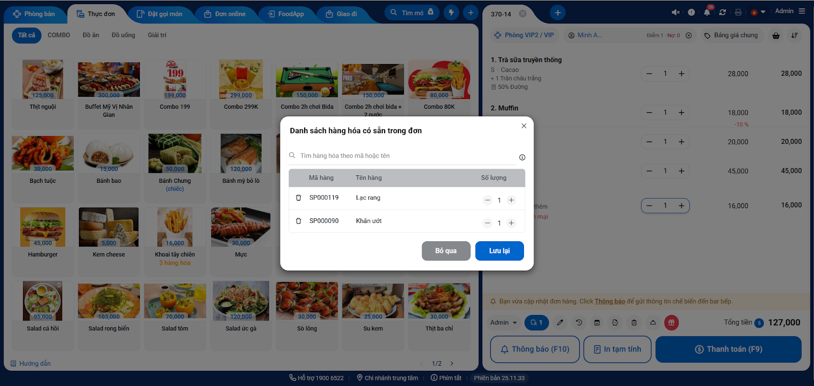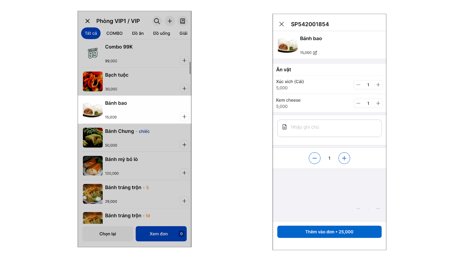 - Tình huống: Khách hàng bắt đầu gọi món, bạn cần thêm các món này vào đơn hàng (bill) của bàn.