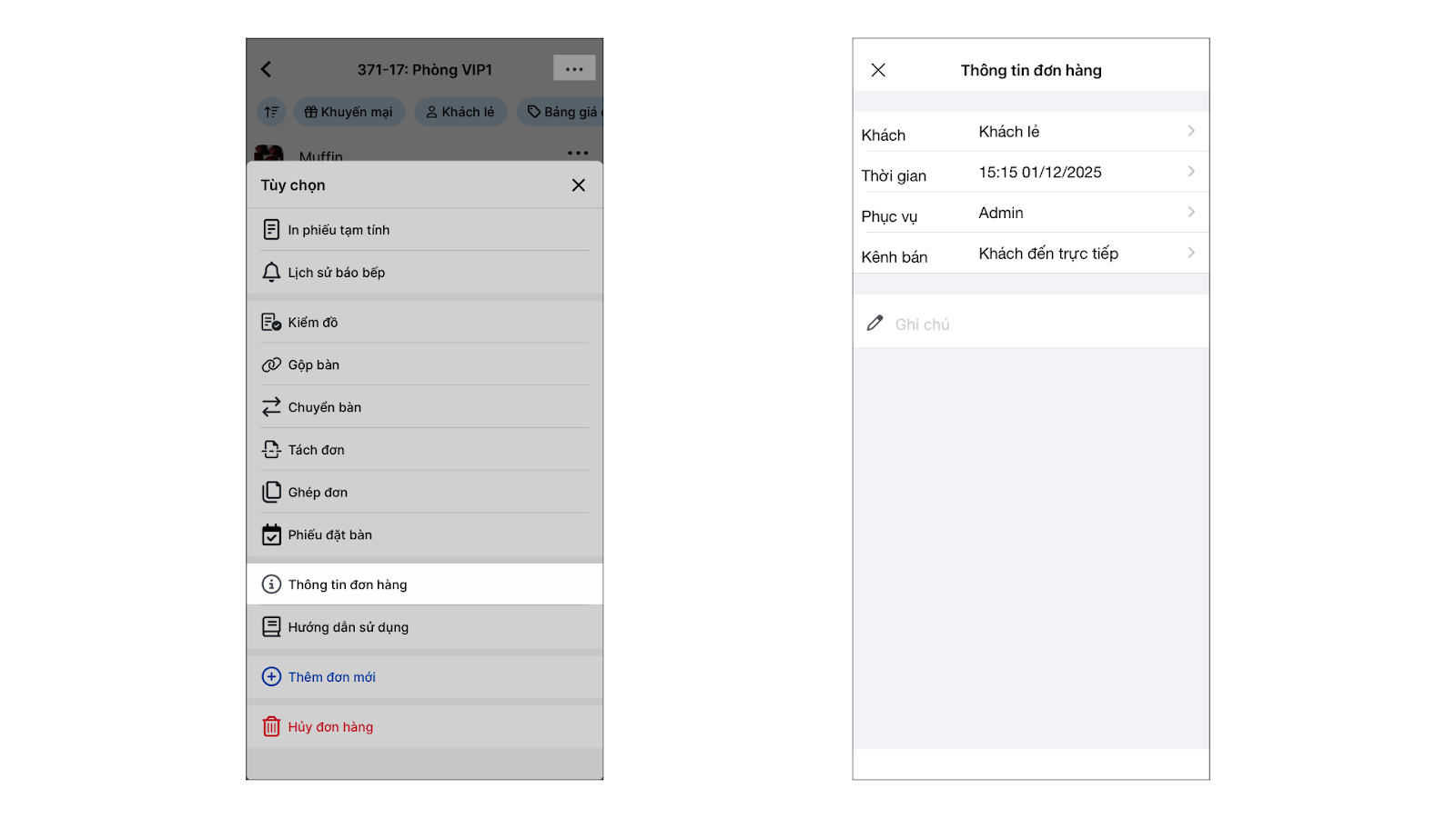 - Tình huống: Cần thêm thông tin khách hàng, nhân viên phục vụ, hoặc ghi chú chung cho cả đơn.