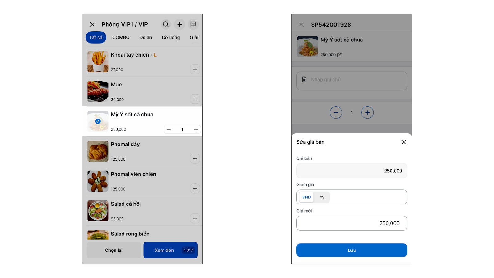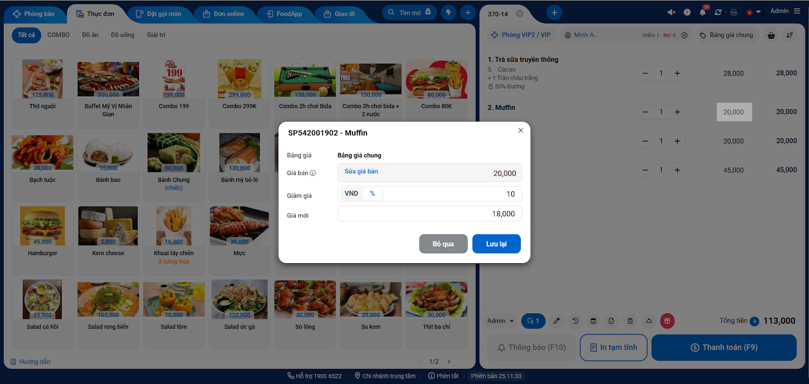 - Tình huống: Bạn cần áp dụng giảm giá riêng cho một món (ví dụ: khuyến mãi đặc biệt) hoặc thay đổi giá bán của món đó ngay trên đơn.