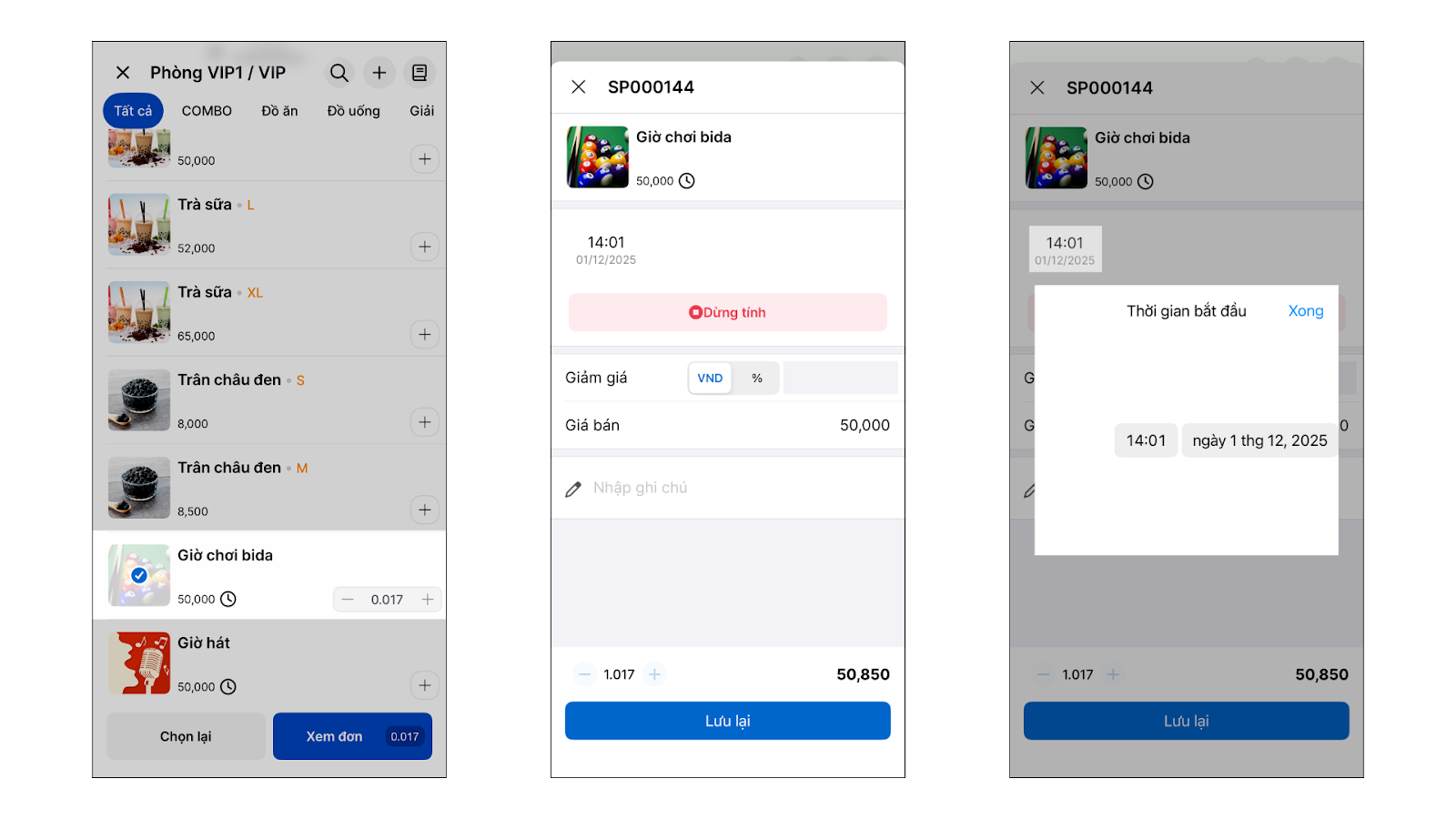 - Thêm dịch vụ tính giờ: Chạm vào món dịch vụ, bạn có thể chạm Dừng tính giờ hoặc sửa Số lượng → chạm Lưu lại.