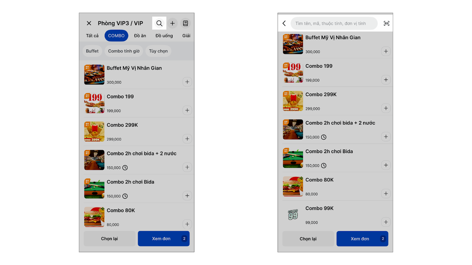 - Bạn gõ tên hoặc mã món ăn/đồ uống vào ô tìm kiếm.