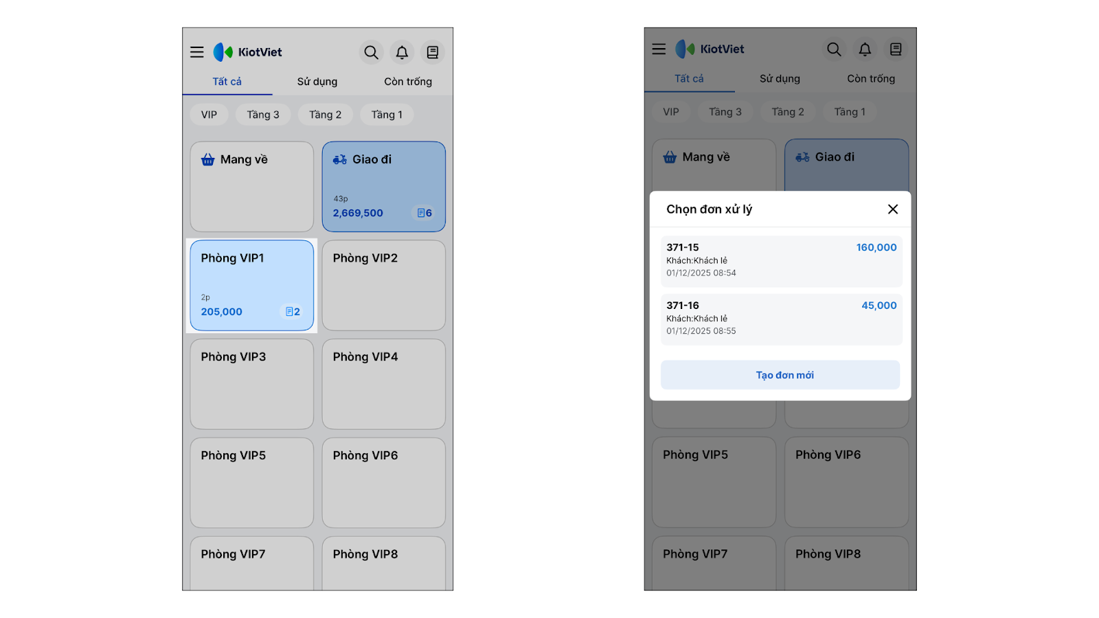 - Nếu phòng/bàn có nhiều hơn 1 đơn: Chạm vào bàn, danh sách đơn hiện ra → chạm Tạo đơn mới.
