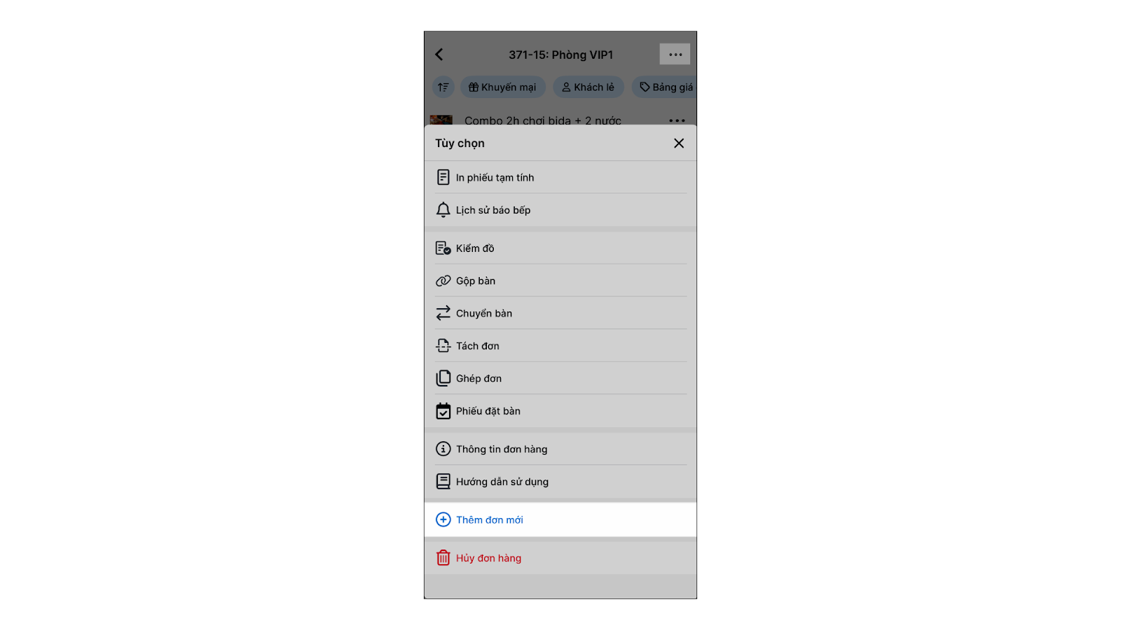 - Nếu phòng/bàn đang có 1 đơn: Chạm vào bàn để mở chi tiết đơn. Chạm vào biểu tượng 3 chấm và chọn Thêm đơn mới.