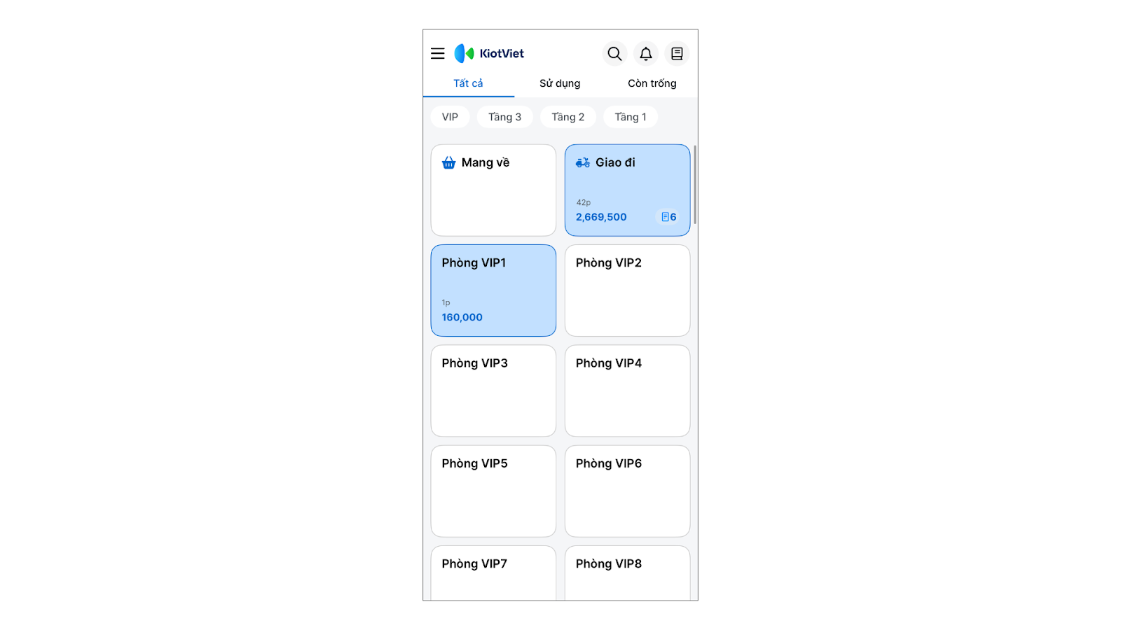 - Nếu phòng/bàn trống: Chạm vào bàn để mở màn hình chọn món.