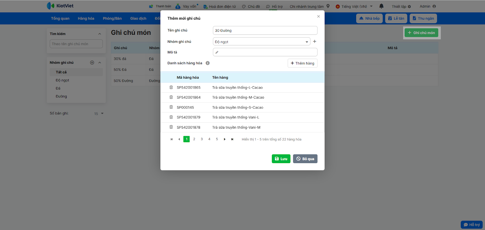 - Tình huống: Gian hàng của bạn (đặc biệt là trà sữa, cafe) có các tùy chọn ghi chú phổ biến (như “Ít đường”, “Nhiều đá”,…) và bạn muốn đồng bộ các ghi chú này để nhân viên chọn nhanh.